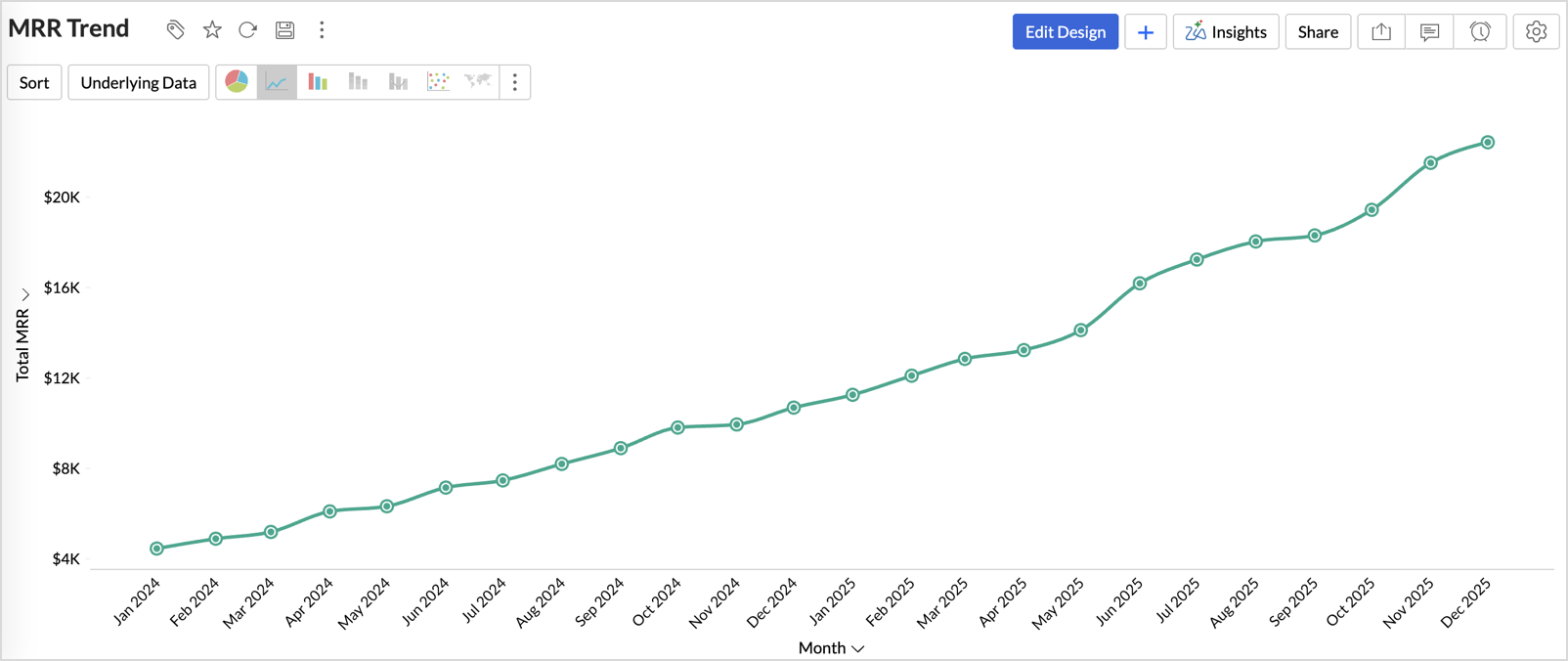 In Zoho Analytics, the dashboard is not a static snapshot. It’s a live environment. See a dip in your MRR Trend? drill into the cause in seconds, and share insights instantly to keep every team aligned.