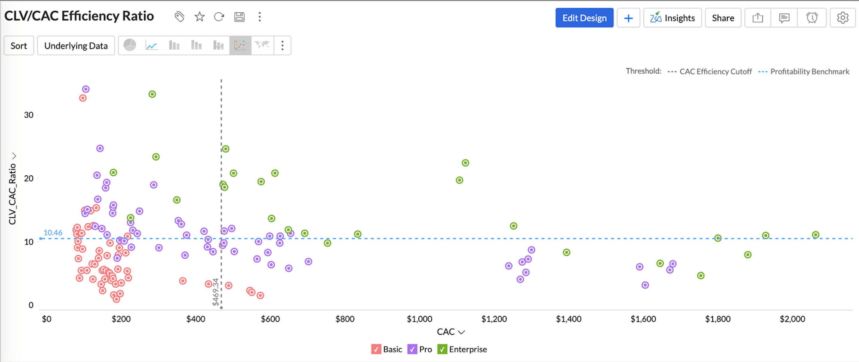 By using clustering to group customers by plan type and applying threshold lines to define efficiency cutoffs, the chart naturally forms clear quadrants.