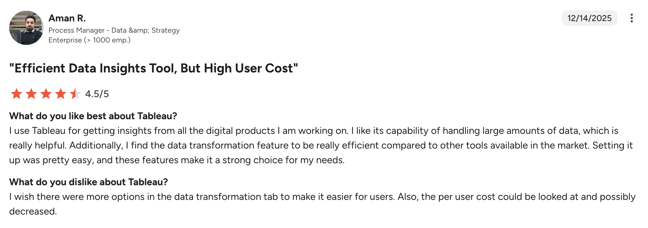 Tableau's built-in data prep features are limited. Users have to switch to Tableau Prep, a separate tool, which comes with its own learning curve and licensing cost.