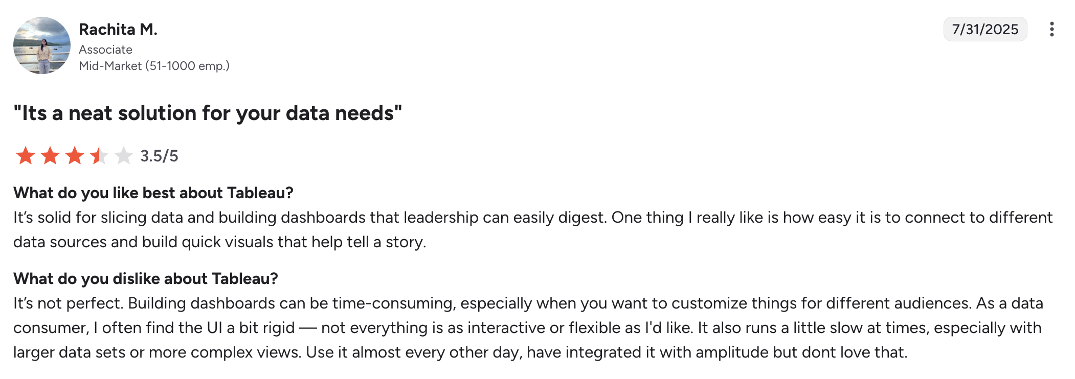 While Tableau allows dashboard sharing, it falls short on real-time collaboration. Features like in-context commenting and detailed permission controls are making it harder to align with everyday business workflows.