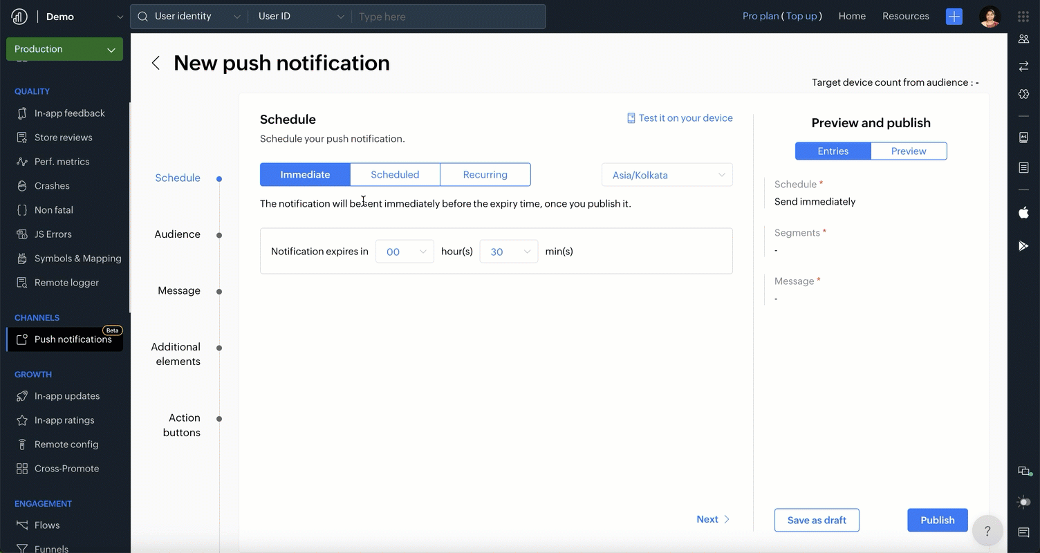 From that point on, you can run reports on it, compare it with other segments, or send a targeted push notification to that exact audience. You can do this by heading to the Push Notification page, where you can choose your saved segment or even create a new one directly from there.