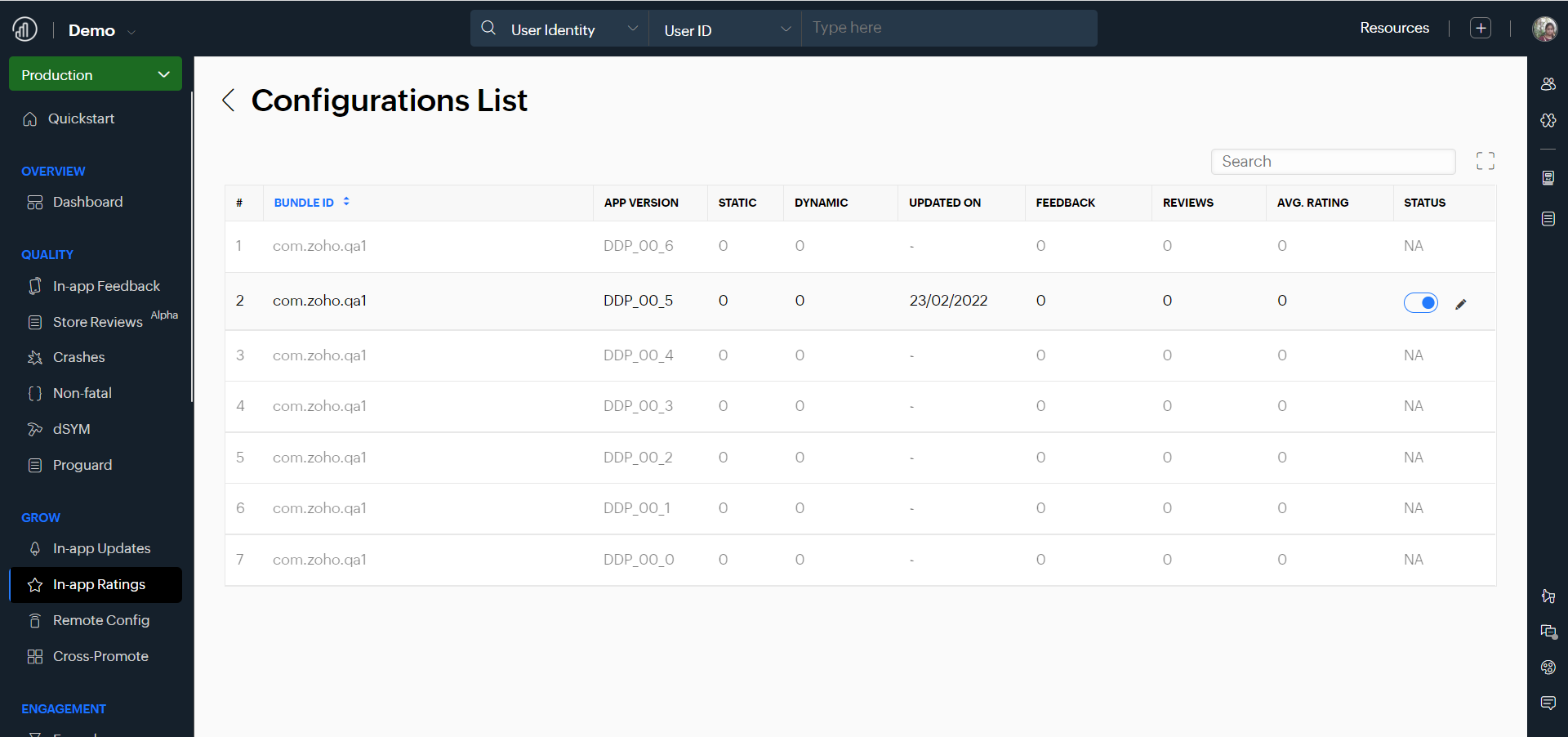 - Once you save the configuration, you will be redirected to the In-app rating dashboard.