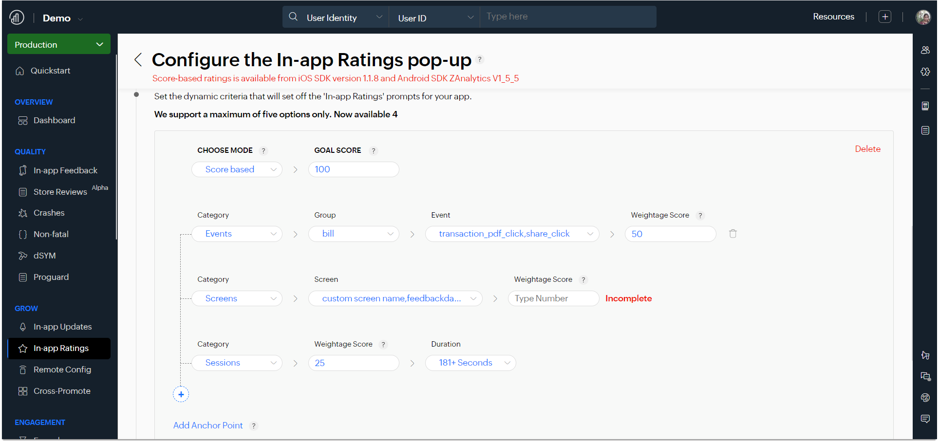 Example: Let's assume that you are configuring score-based criteria using Events and Sessions and the total Goal score is configured as 80. For Events, the weightage score is 40 and for Sessions, it is 40. Now, if the user satisfies this criterion, the rating pop-up will be shown. Further, you can also add Anchor Points to this configuration.