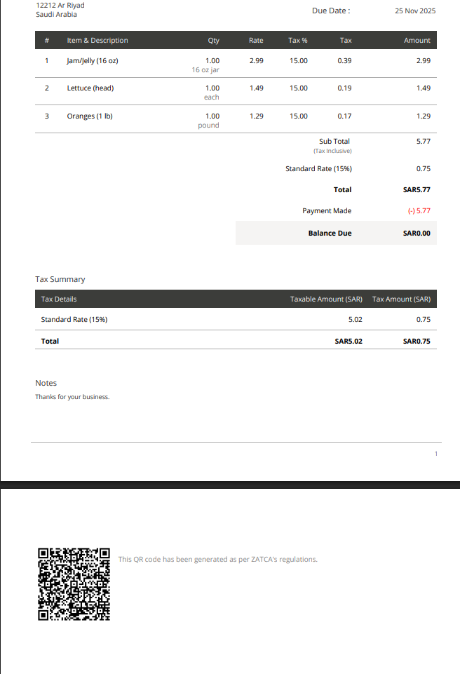 كل Invoice مبسطة تتضمن رمز الاستجابة السريعة (QR) الإلزامي الذي يحتوي على تفاصيل أساسية مثل: