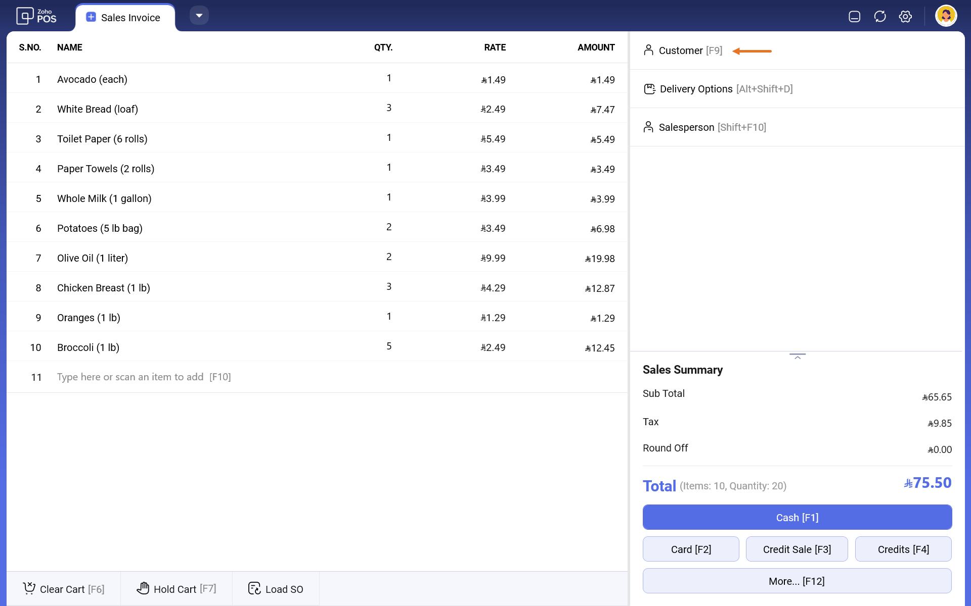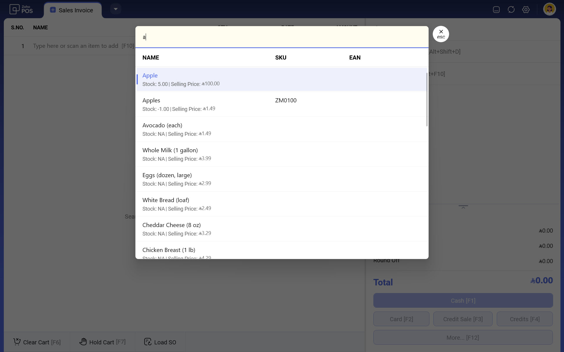 استخدام البحث: يمكنك استخدام شريط البحث أعلى الصفحة لإدخال اسم المنتج أو الكود واختيار العنصر المطلوب من النتائج. اختصار لوحة المفاتيح للوصول إلى البحث هو F10. بشكل افتراضي، يمكنك البحث باستخدام اسم المنتج.