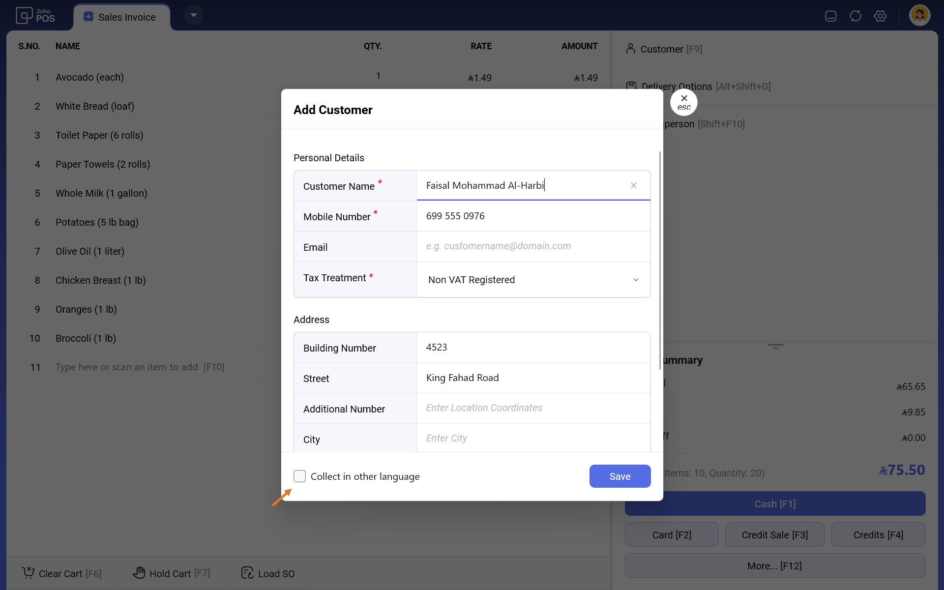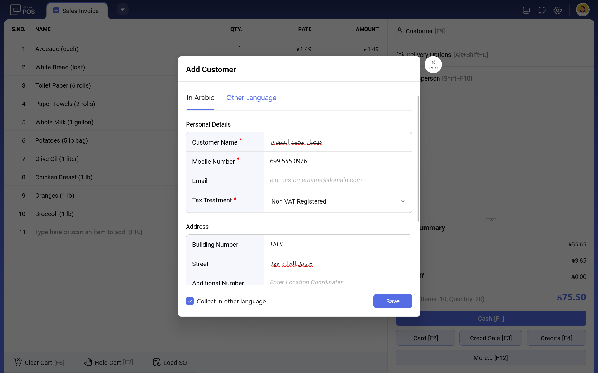 أثناء معالجة عملية البيع، يمكنك اختيار إضافة معلومات العميل إلى الفاتورة. يمكنك اختيار ربط عميل موجود أو إضافة عميل جديد أثناء billing.