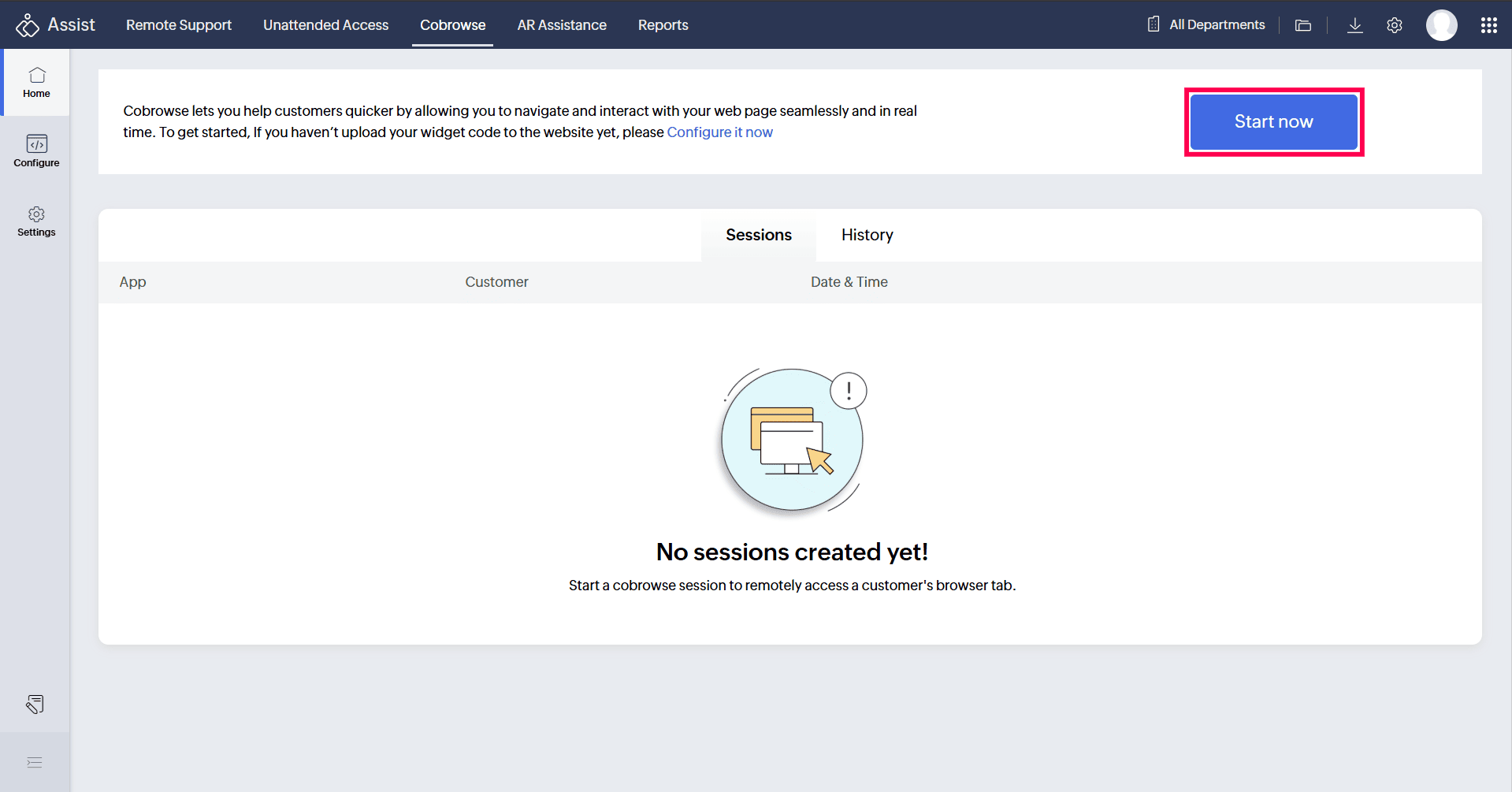 Navigate to the Cobrowse tab and click Start Now.