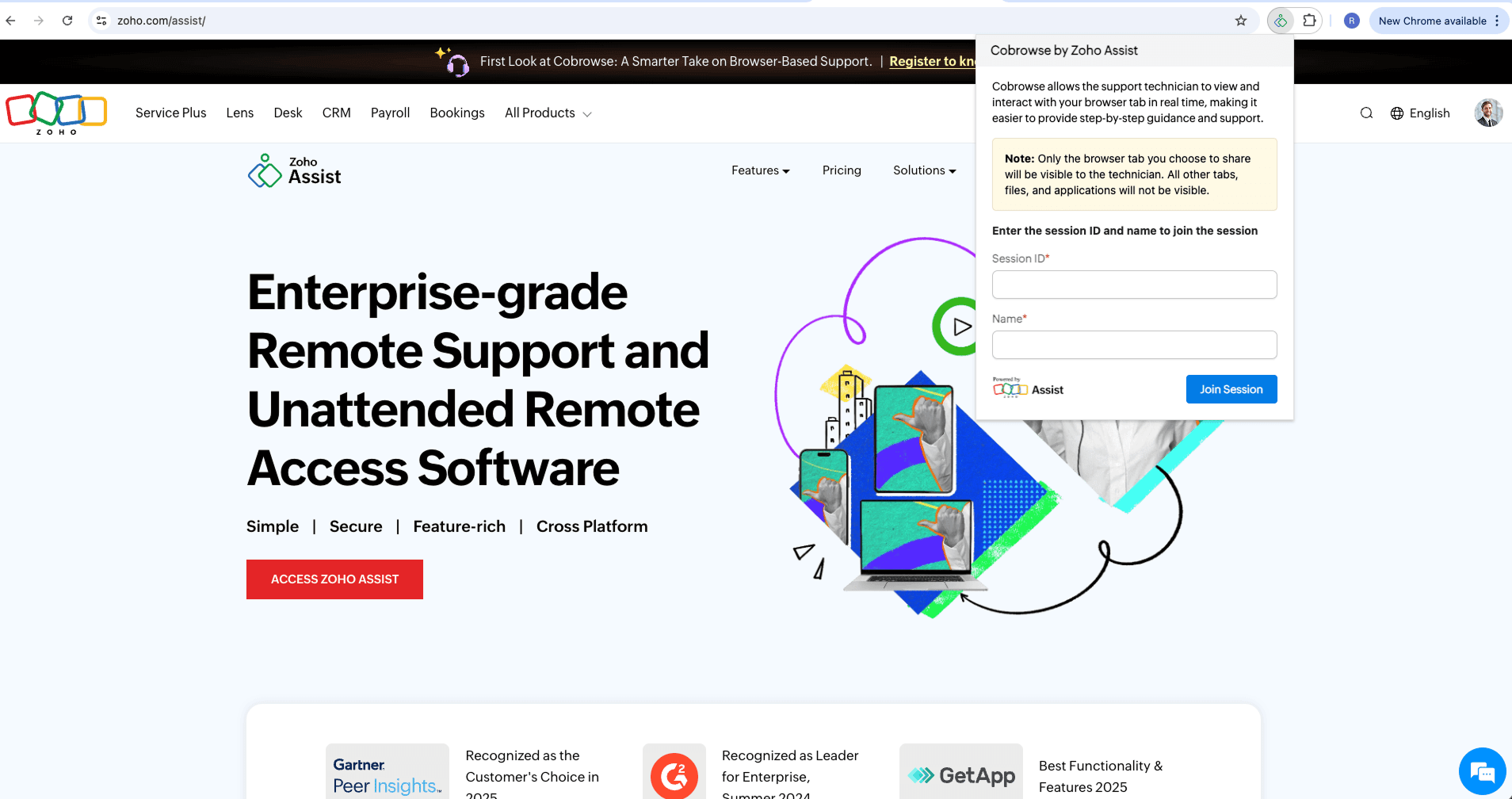 Cobrowse by Zoho Assist provides a browser extension that helps technicians and customers connect to a session easily.