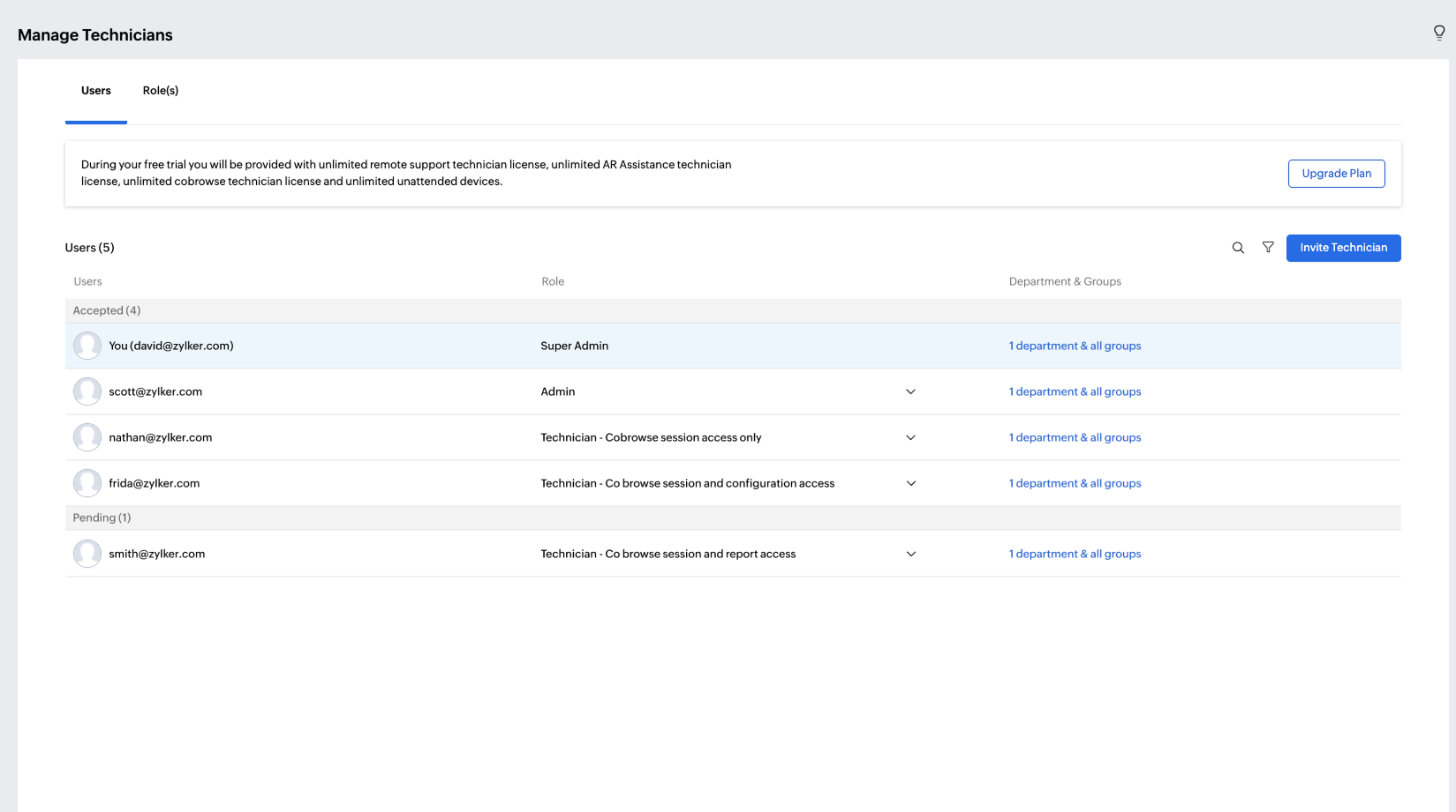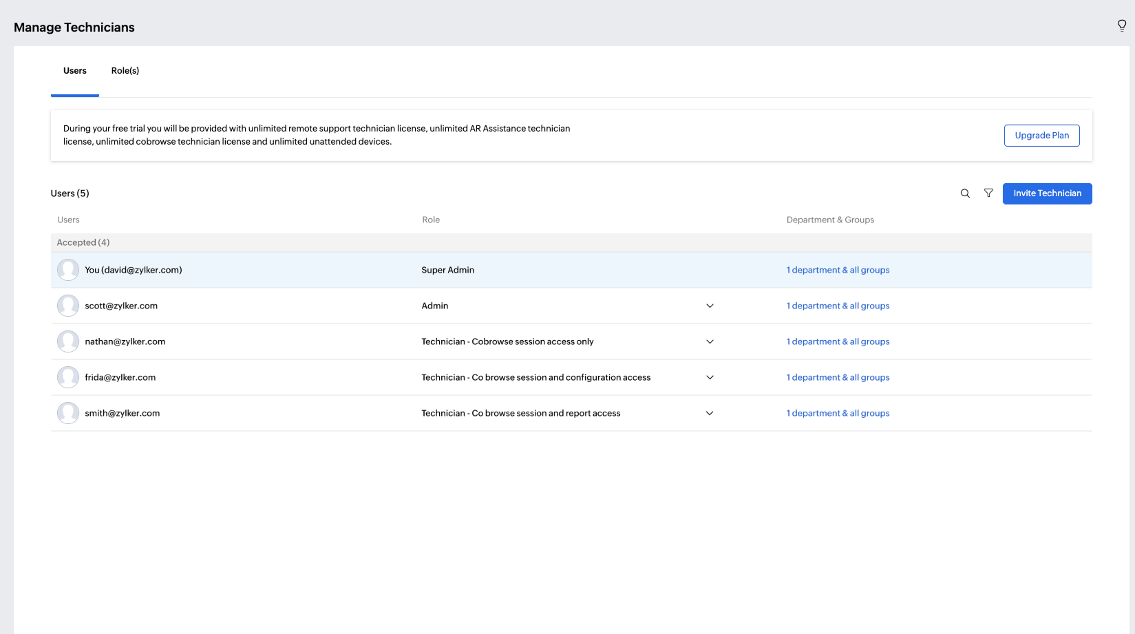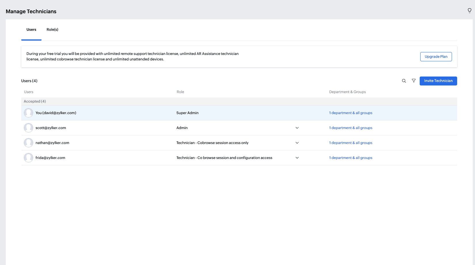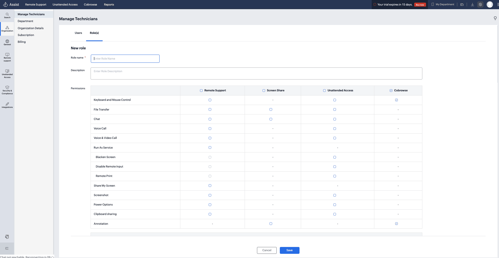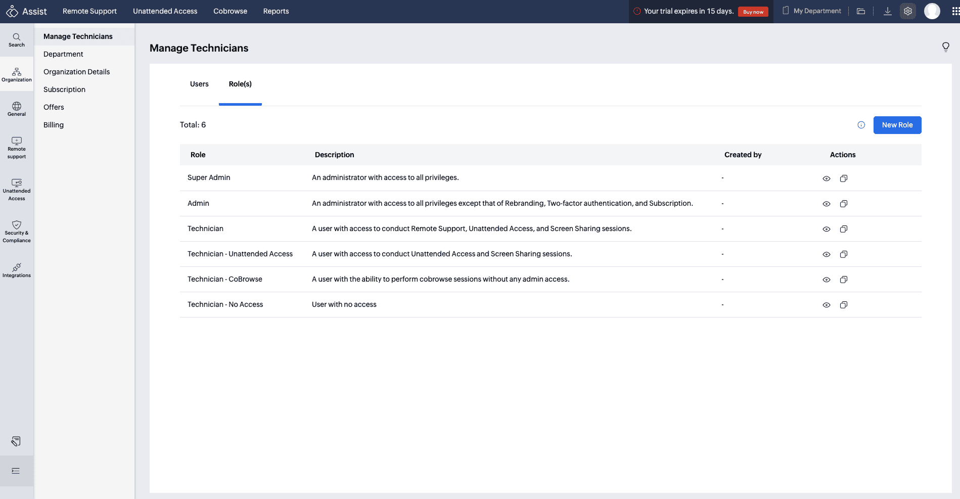 The Manage Technicians section allows you to assign access levels and permissions to your team members based on your organizational requirements. With Cobrowse, you can either assign a predefined role (Technician – Cobrowse) or create custom roles to tailor access and permissions as needed.