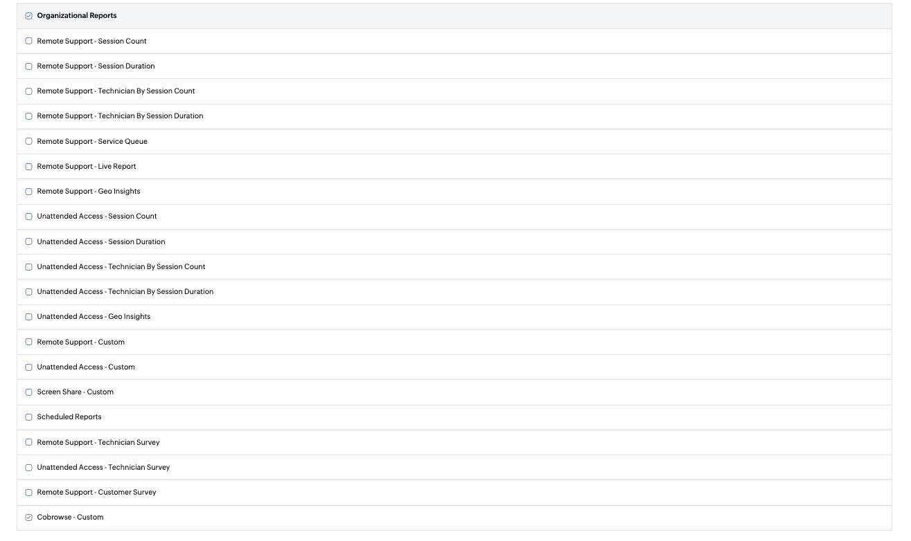 Custom Role – Can view Cobrowse reports if the Cobrowse-Custom permission is enabled in organization settings.
