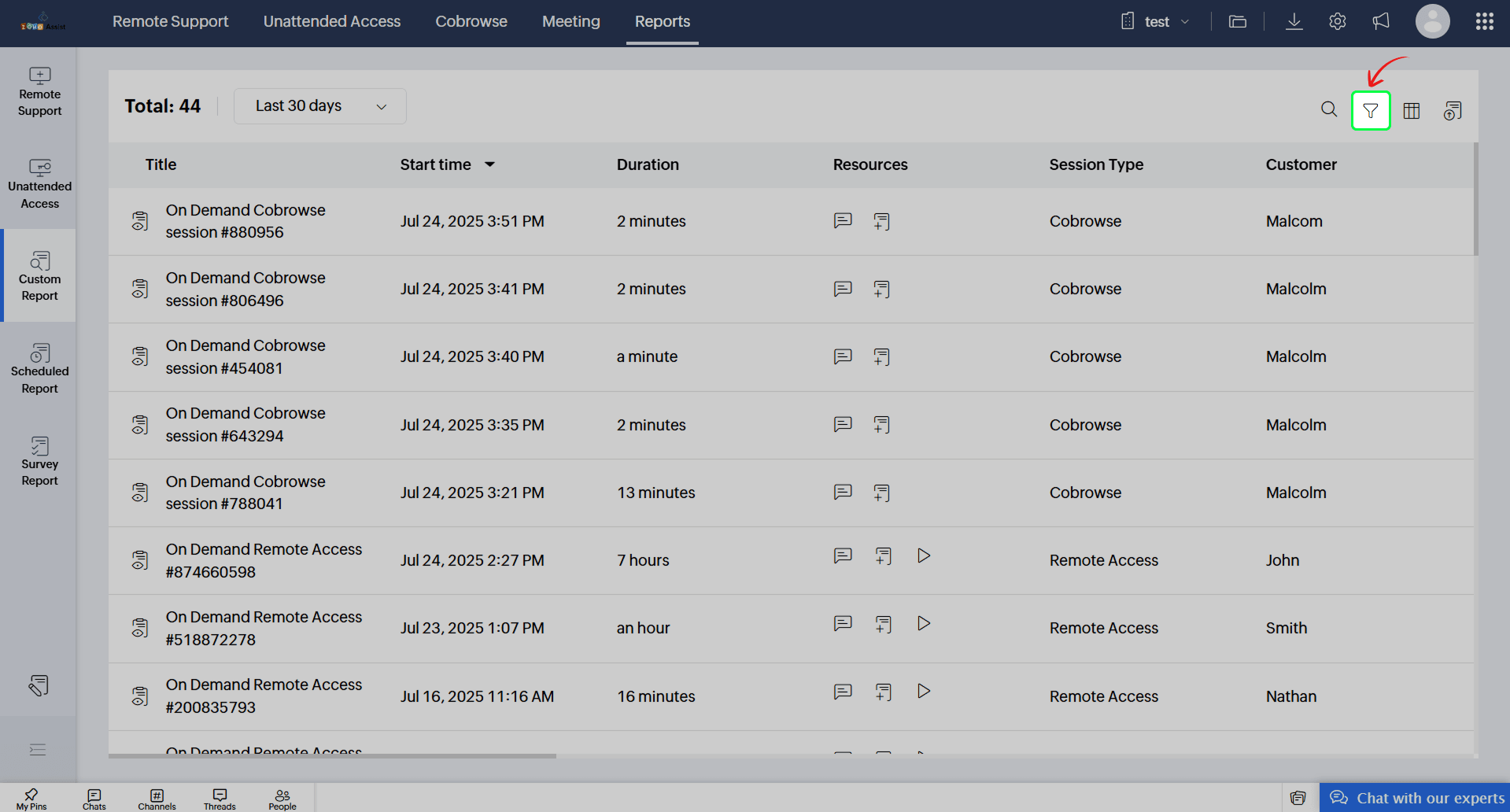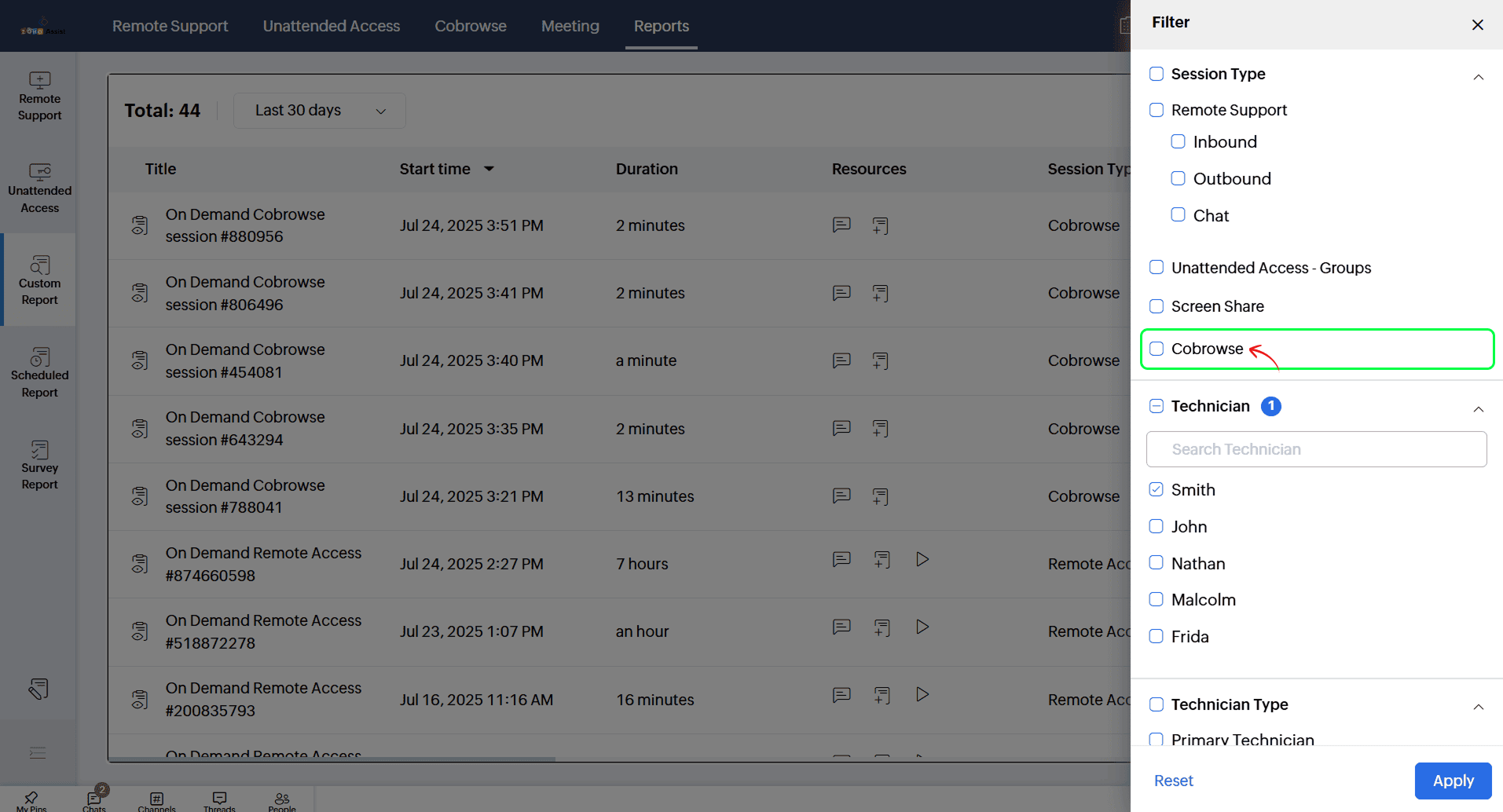 You can track and review your past cobrowse sessions in Zoho Assist using the Reports section.
