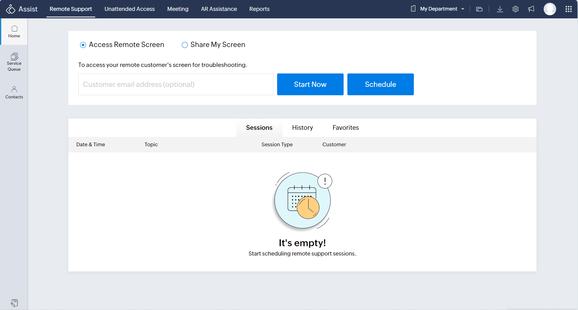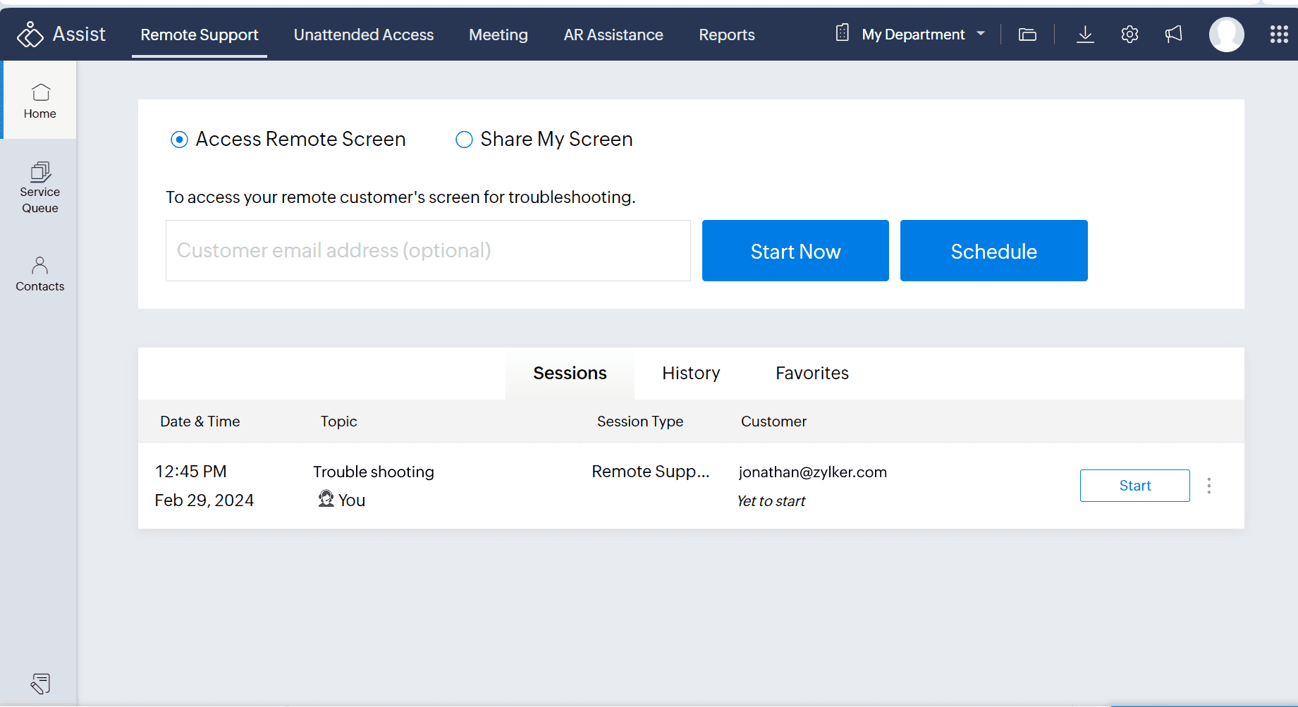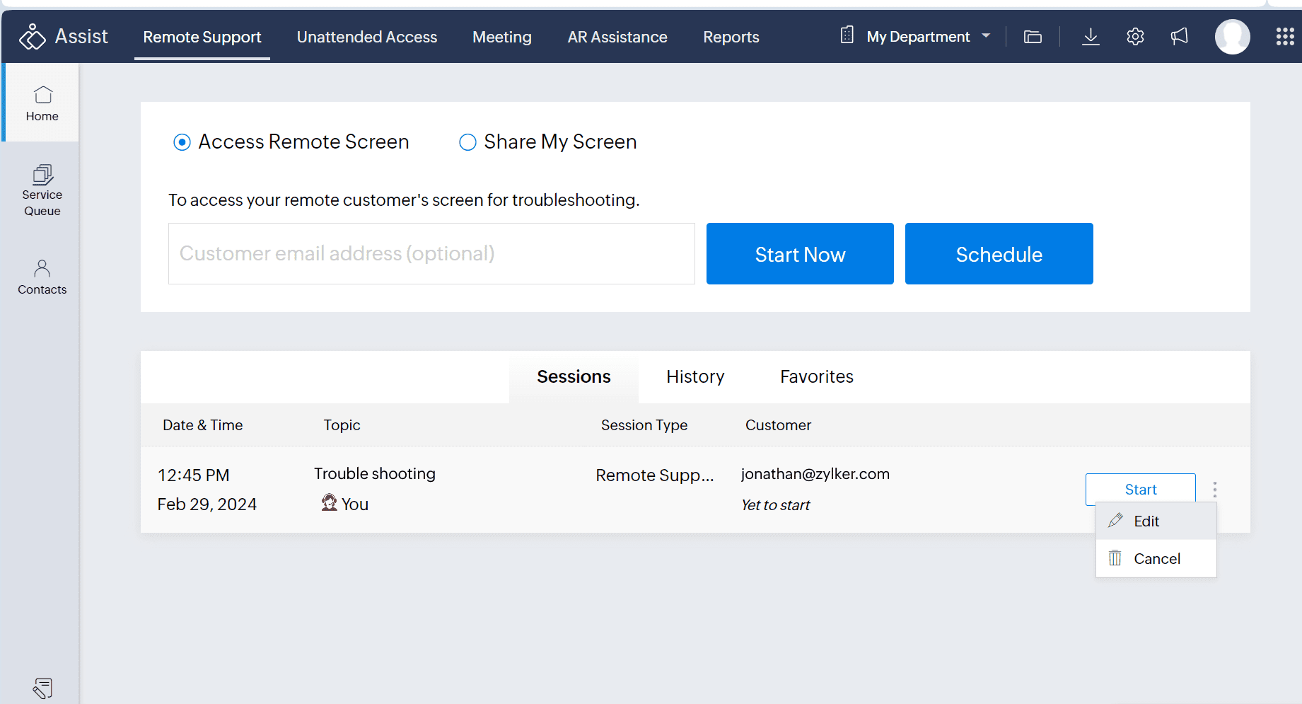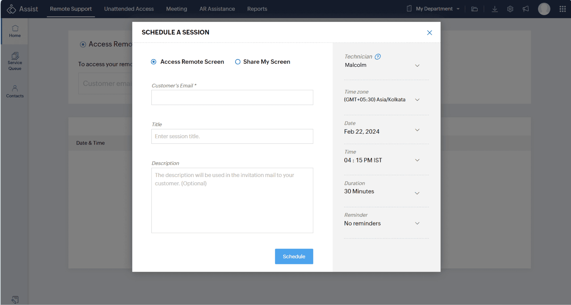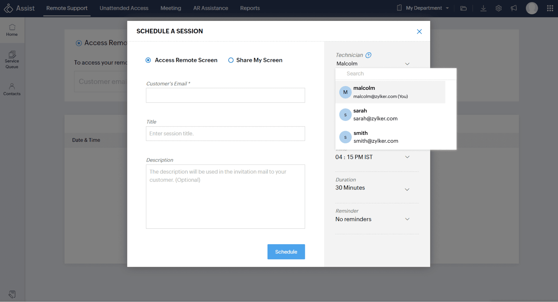 Select a technician within your department from the drop-down menu for scheduling or assigning a remote session . You can als modify the assigned technician at any point in the future.