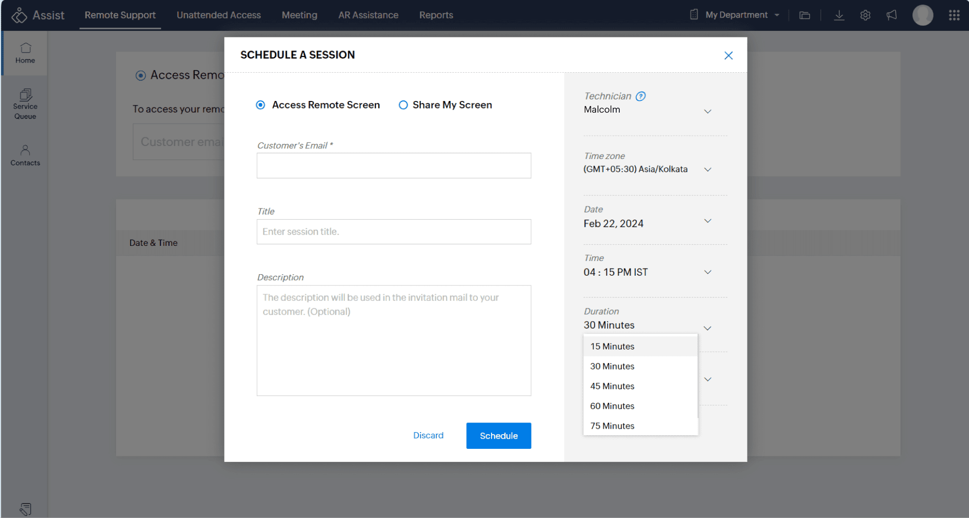 Choose the time zone, date, and time for the session. Set the desired duration of the remote session from the available options in the drop-down menu.