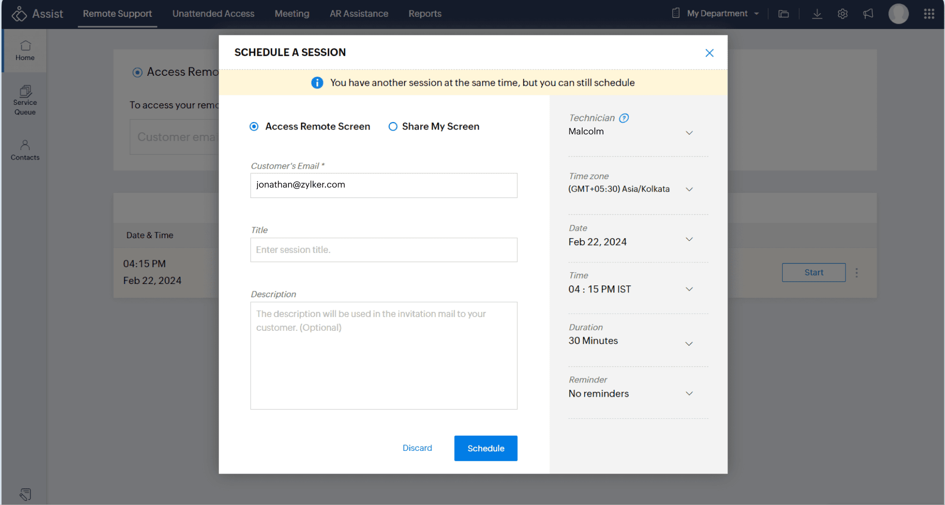 Enter customer details, including email, title, and session description. Click Schedule to confirm the session. The session has been successfully assigned to the technician.