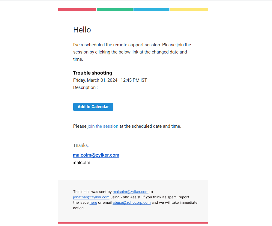 Once a session is assigned, the technician will receive an email notification. If the session is rescheduled, the same will also be notified via an email as shown below.