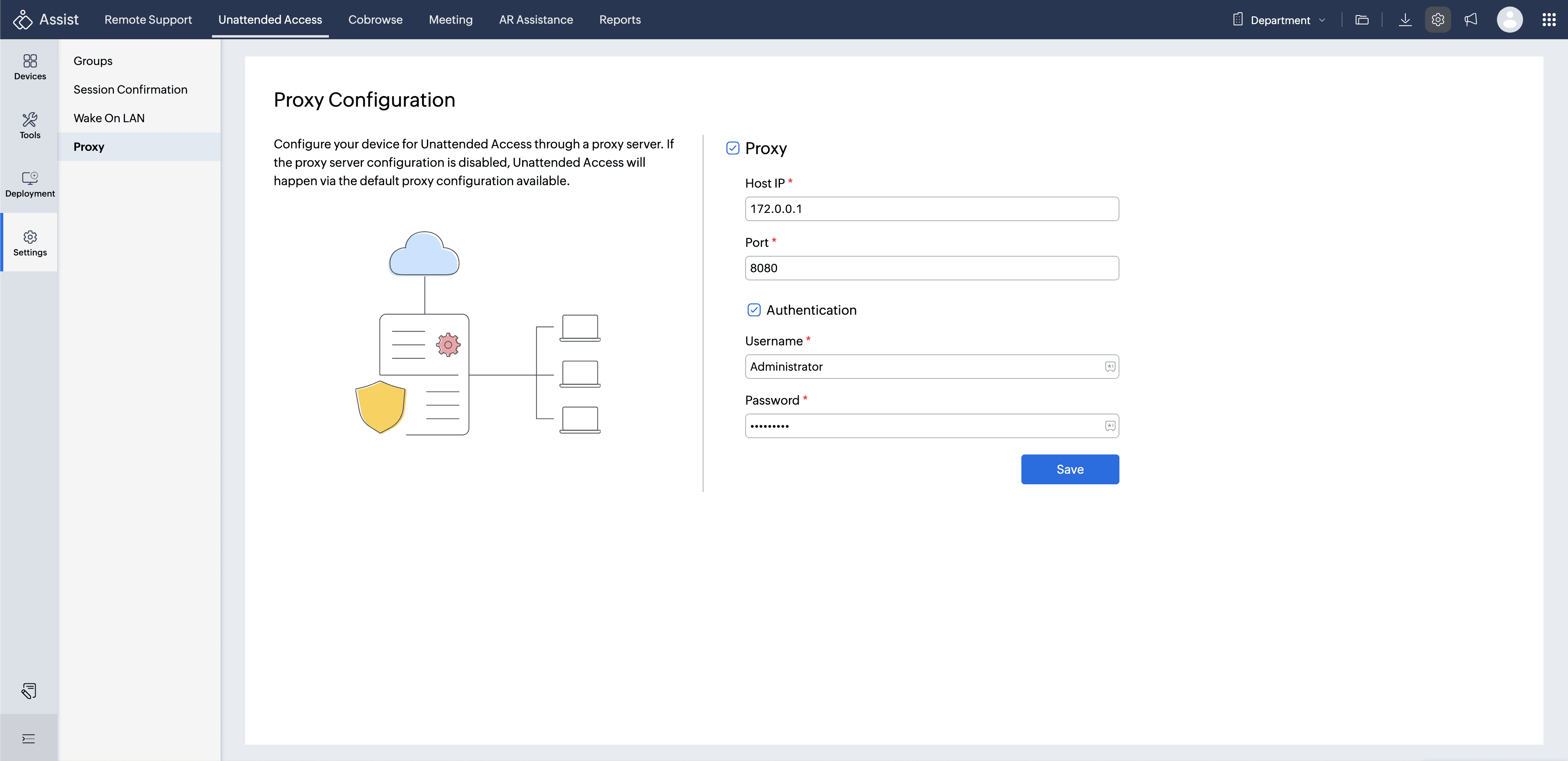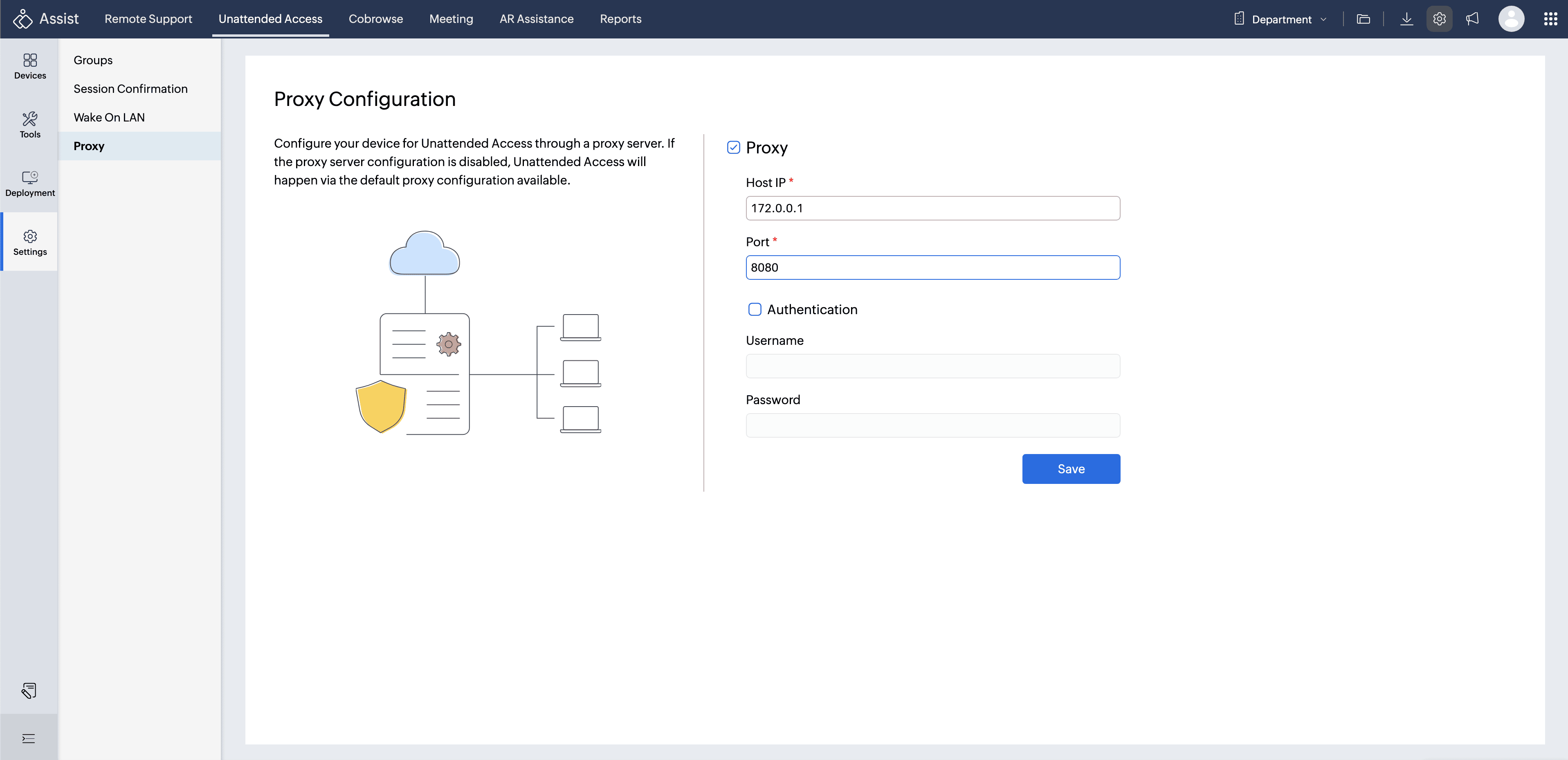 Click Save to apply the configuration. Zoho Assist will then route Unattended Access installations through the specified proxy server.