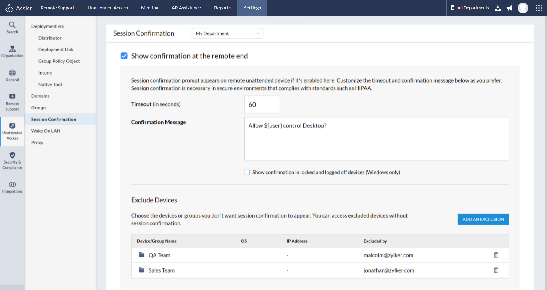 - Navigate to Settings in Zoho Assist. Under Unattended access choose Session Confirmation. Click the dialogue box that says Show confirmation at remote end.