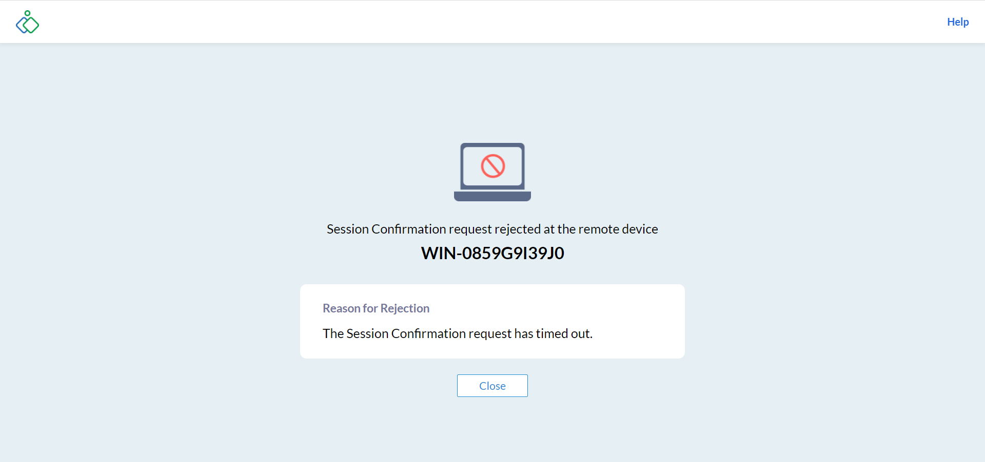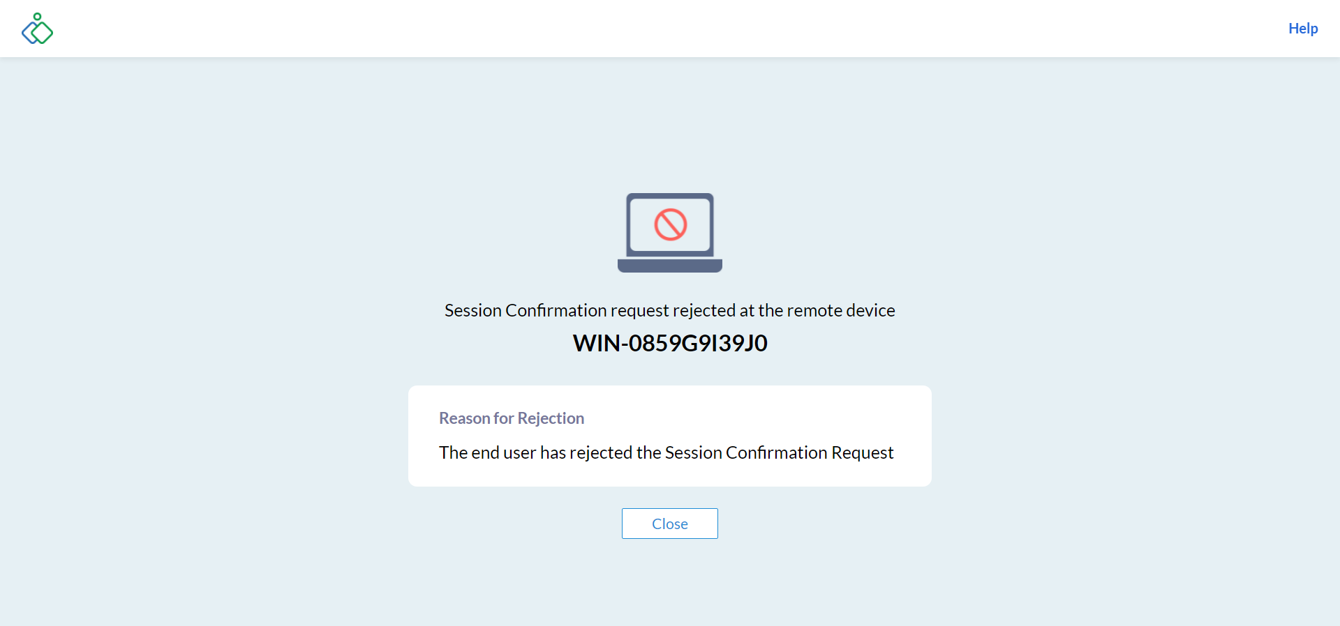 If the end user rejects the session request, the technician will be redirected to the window below and the technician can close the session and try again later.