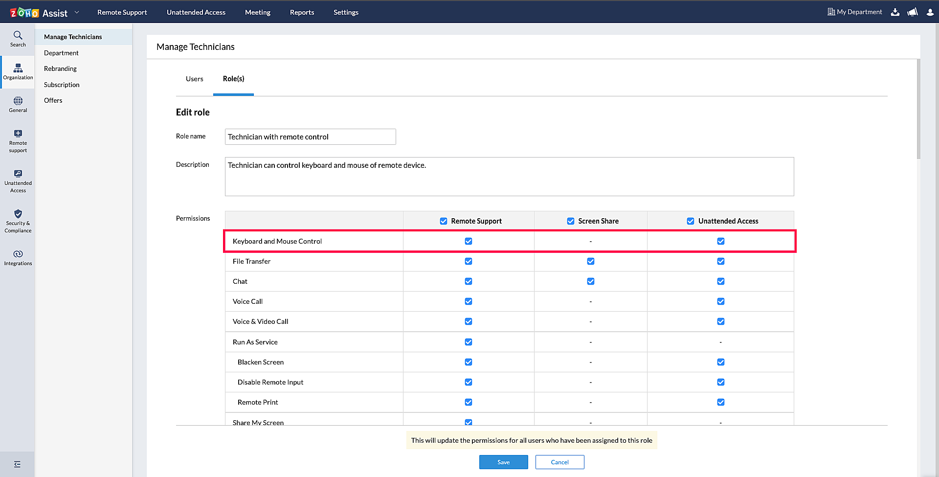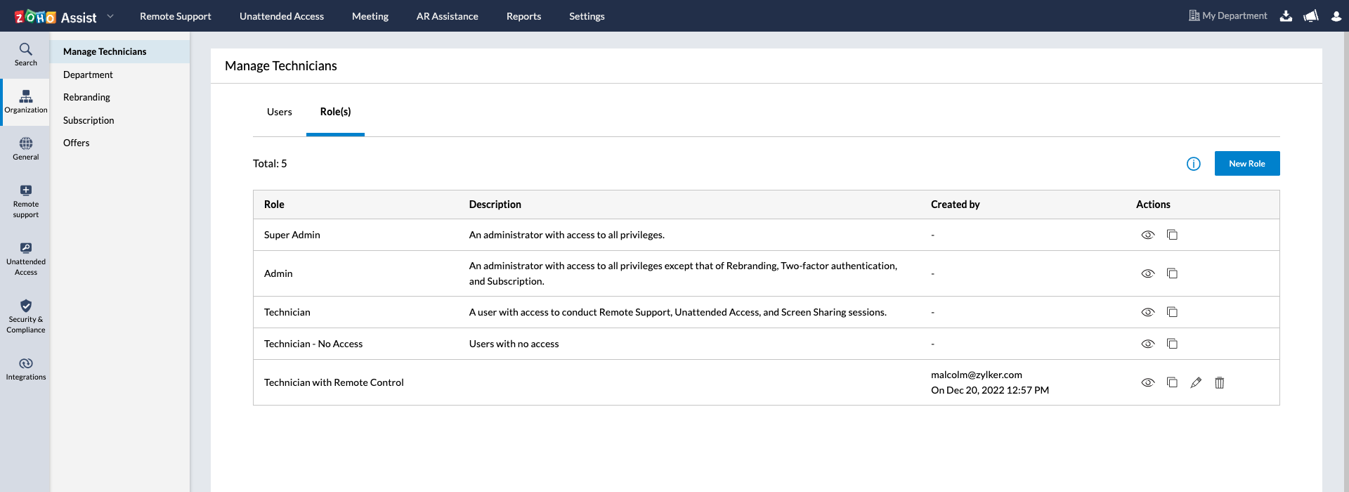 Select Role(s) and choose the edit option beside the technician role to edit their remote control permission.