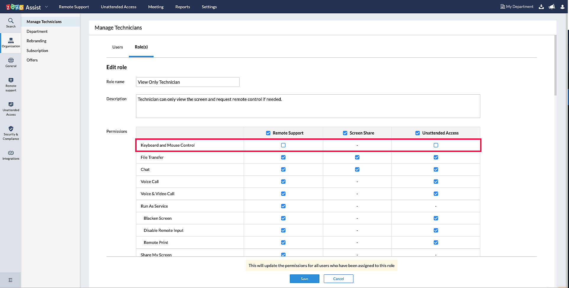 For SDK user, when Keyboard and Mouse control is disables for a custom role, the technicians are limited to View only Mode and cannot request control. To gain control, they need to enable the 'Keyboard and Mouse control' for that custom role.