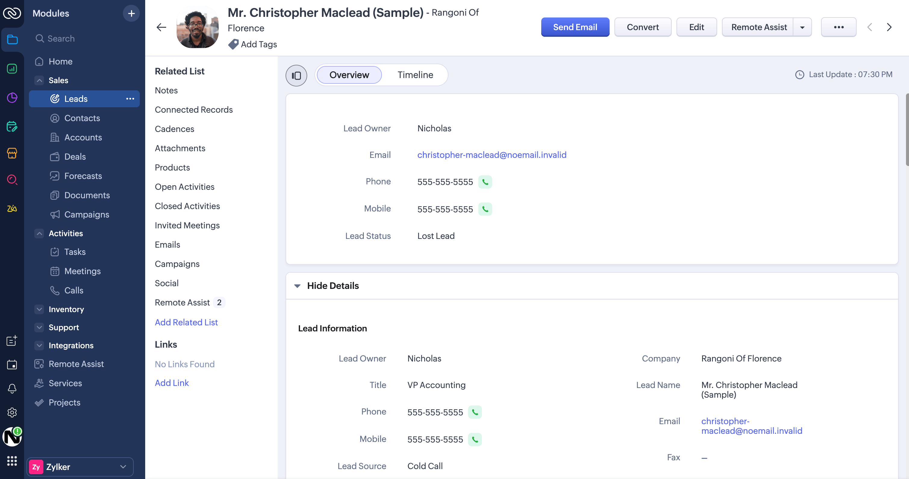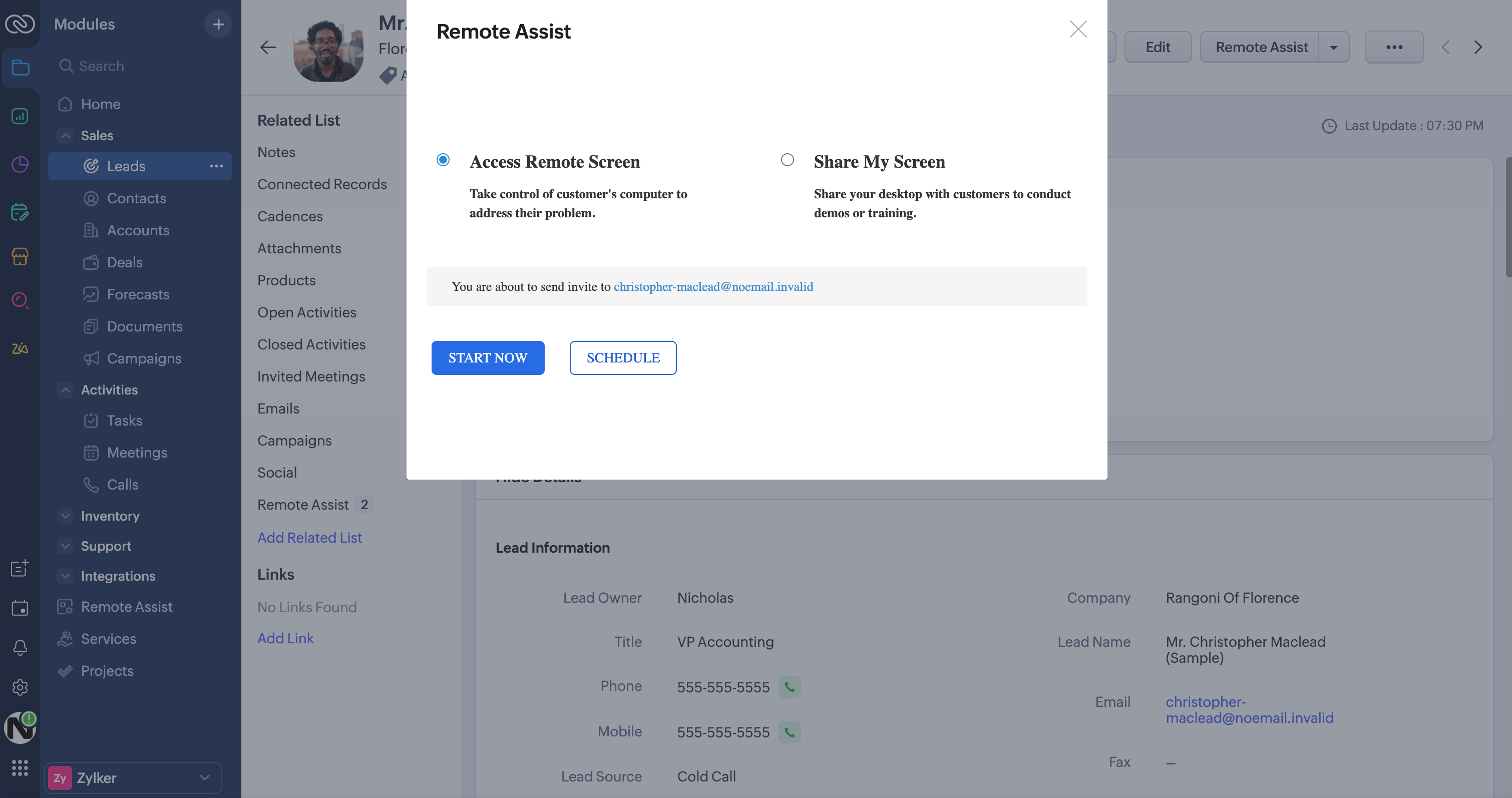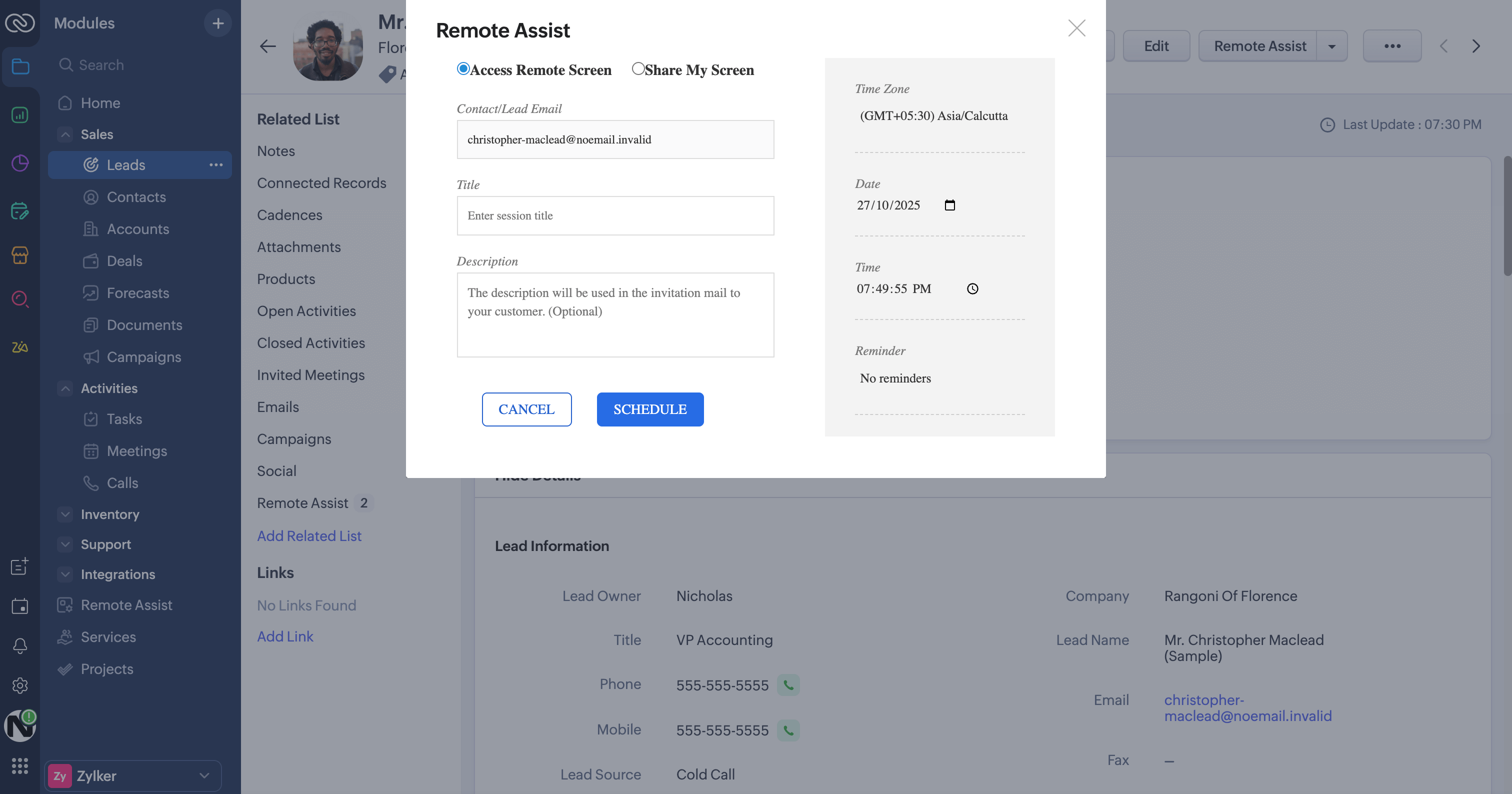 - Select a lead or contact, then click the Remote Assist option in the top-right corner.