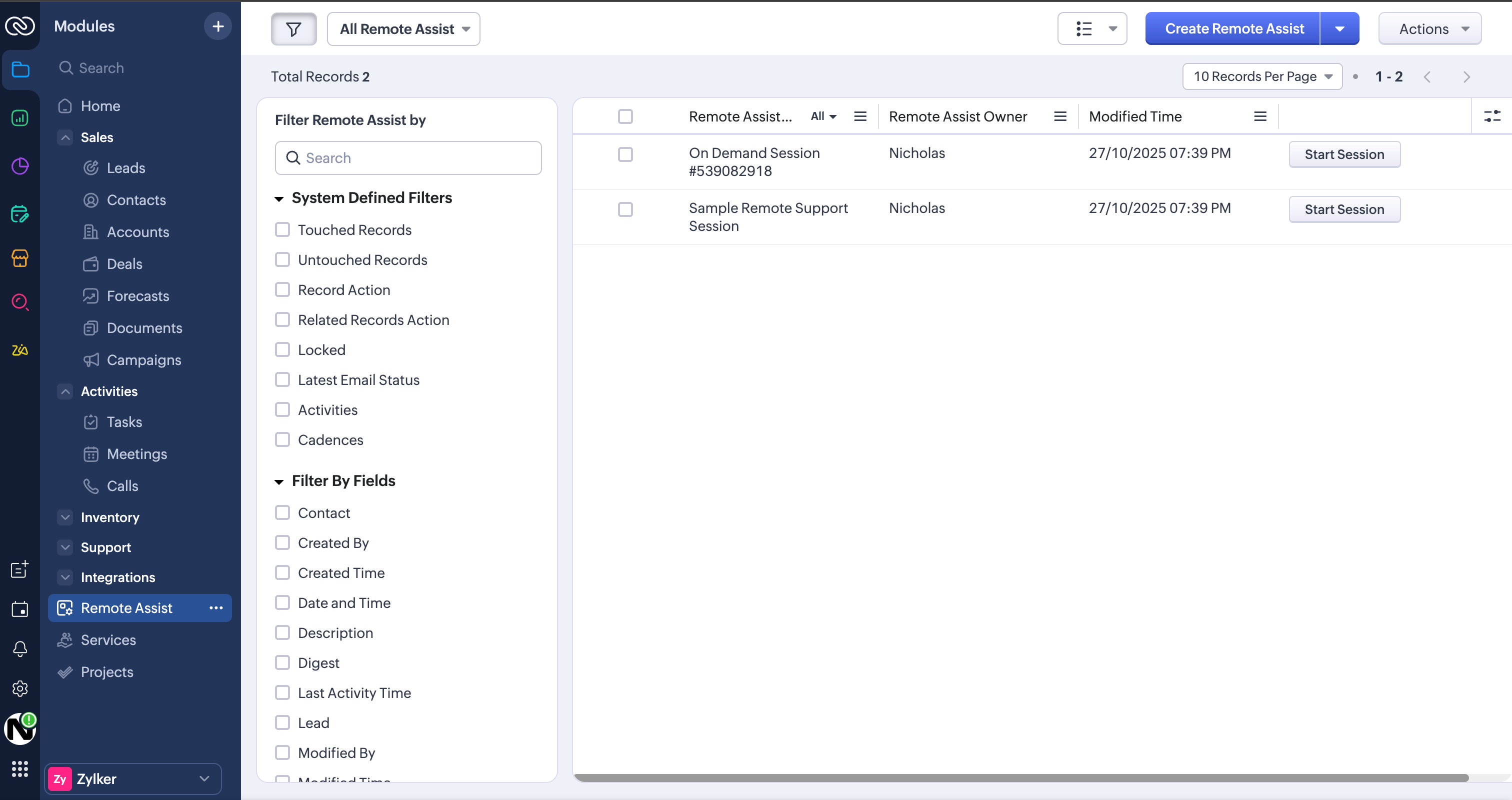- To start a session for any lead or contact, navigate to the Leads or Contacts module.