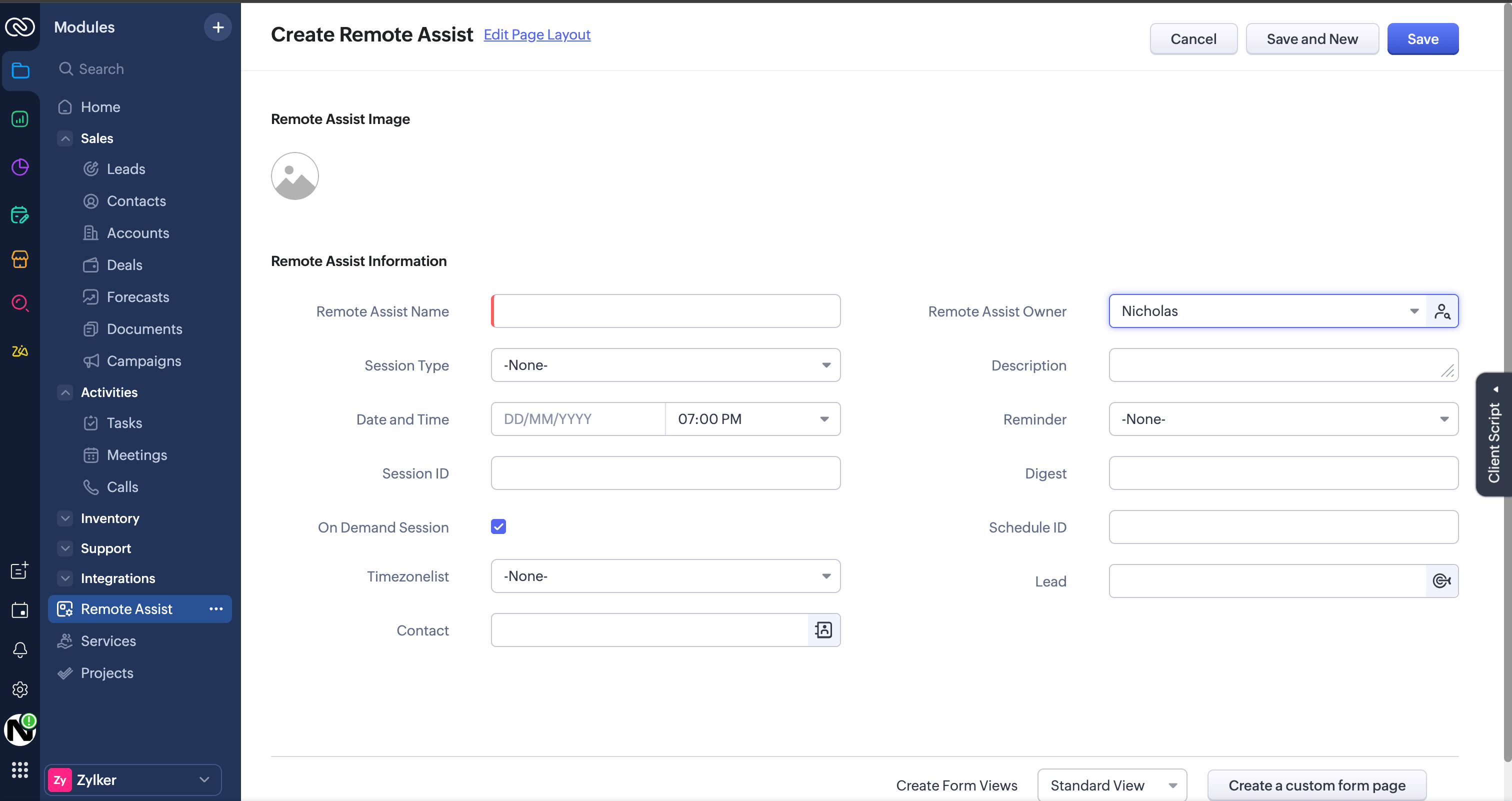 - You can also select the New option in the Remote Assist section, then fill in the required details to create a session for any lead or contact when required.