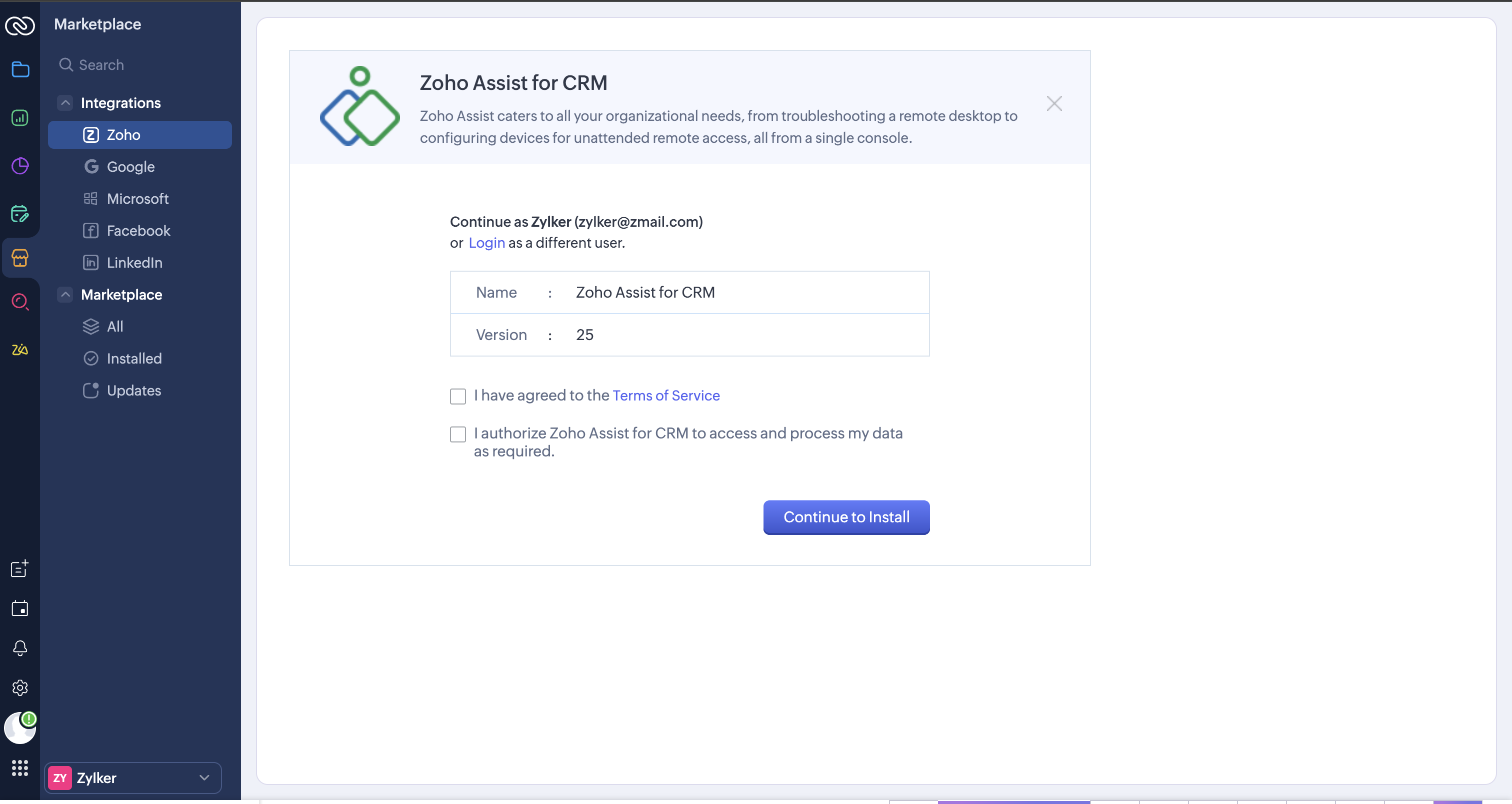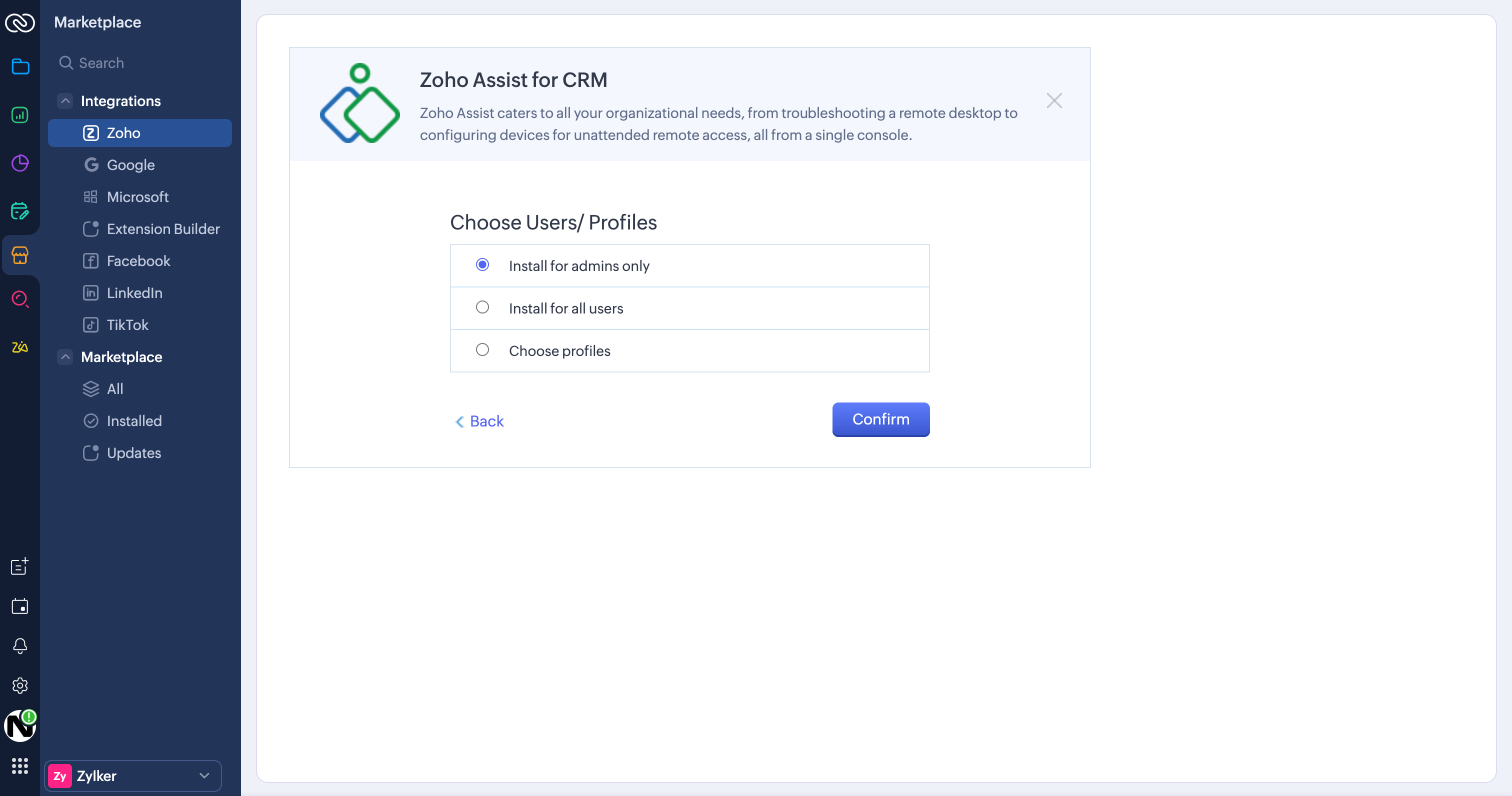 - Navigate to the Marketplace category and choose Zoho.
