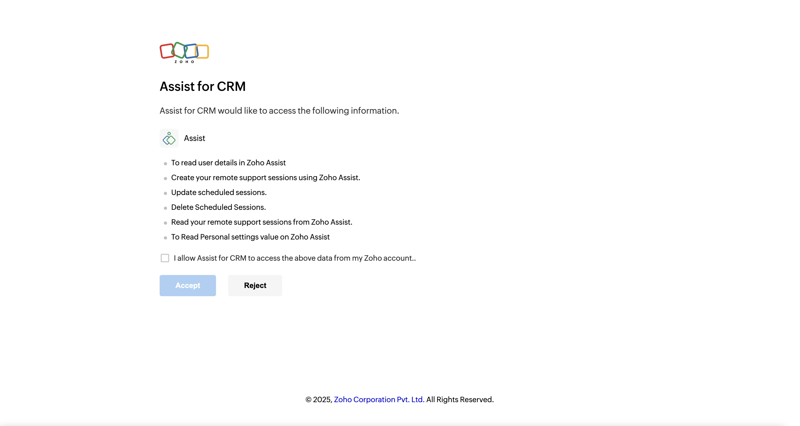- Click the Accept button to allow Assist for CRM to access all data related to your Zoho Assist account.