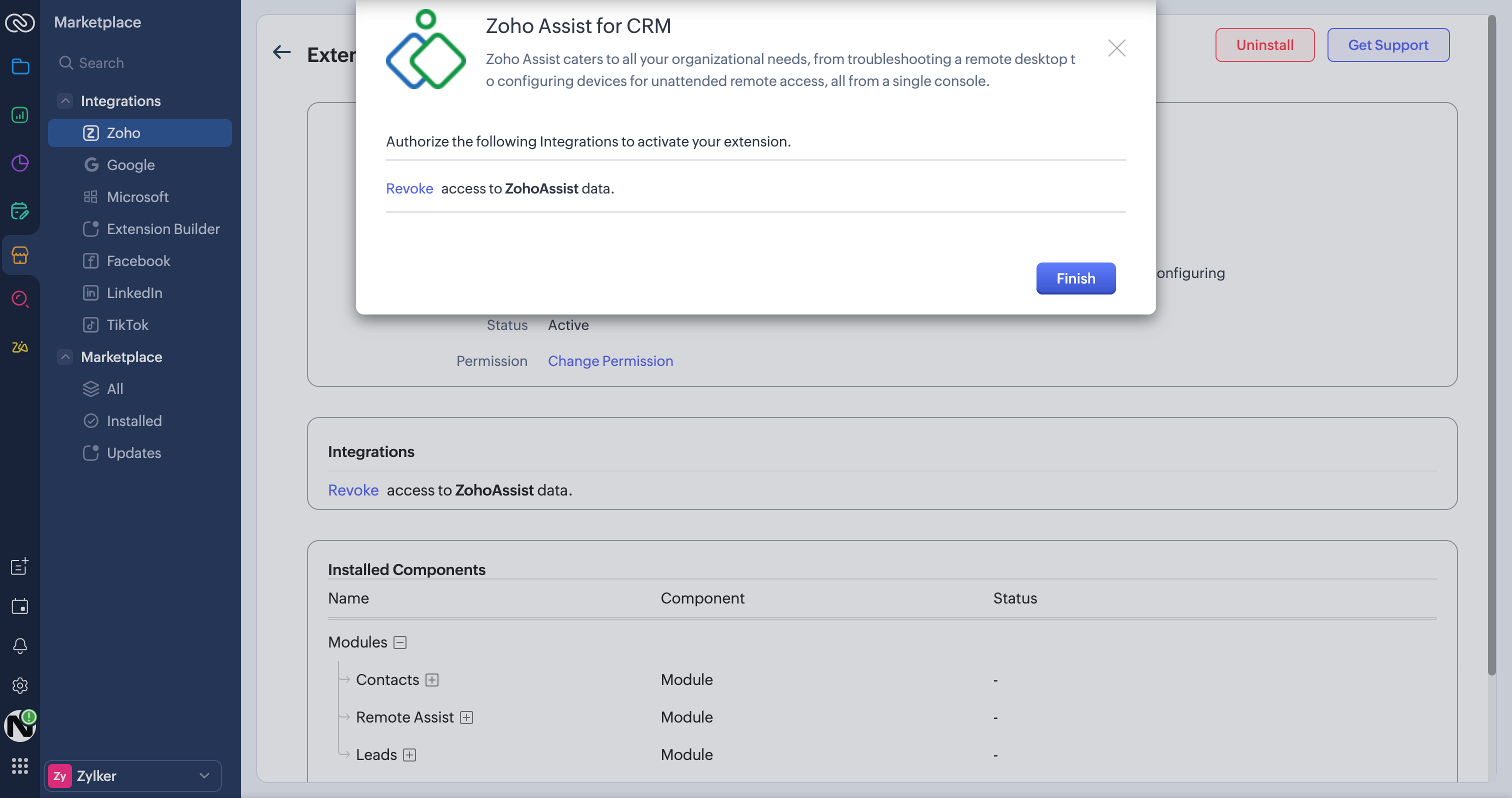 - Click Finish. The Zoho Assist for CRM extension has now been installed successfully.