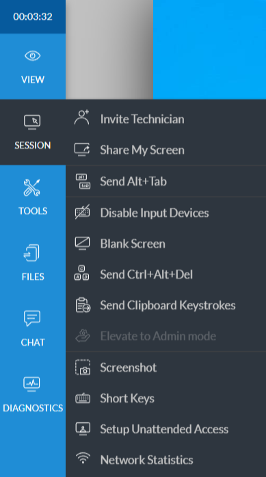- Invite Technician: Invite a secondary technician from within or outside your organization during a session for assistance.