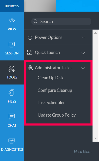 Quick Launch provides shortcuts to navigate through the remote computer quickly. You can manage files, uninstall software, access system tools, and more.