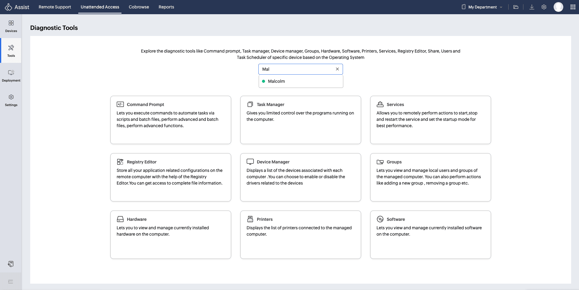 - From the Tools Section - Navigate to Unattended Access > Tools. Search for and select the required device. Click File Manager from the left sidebar.