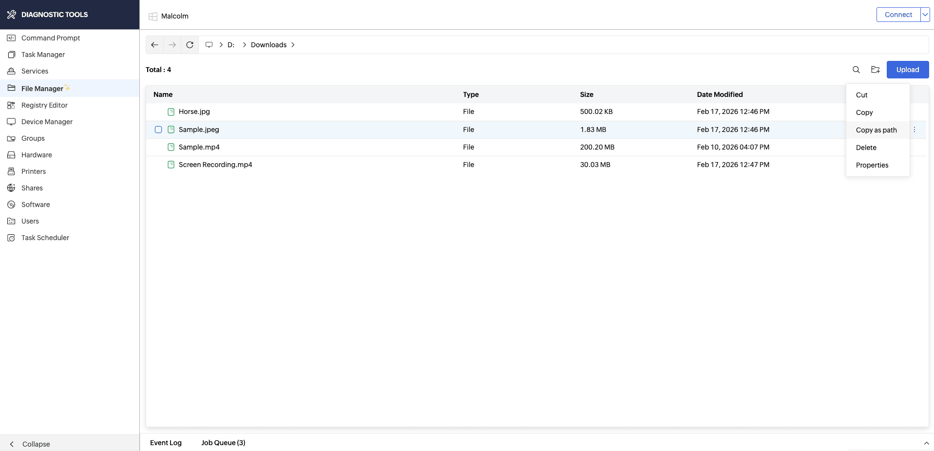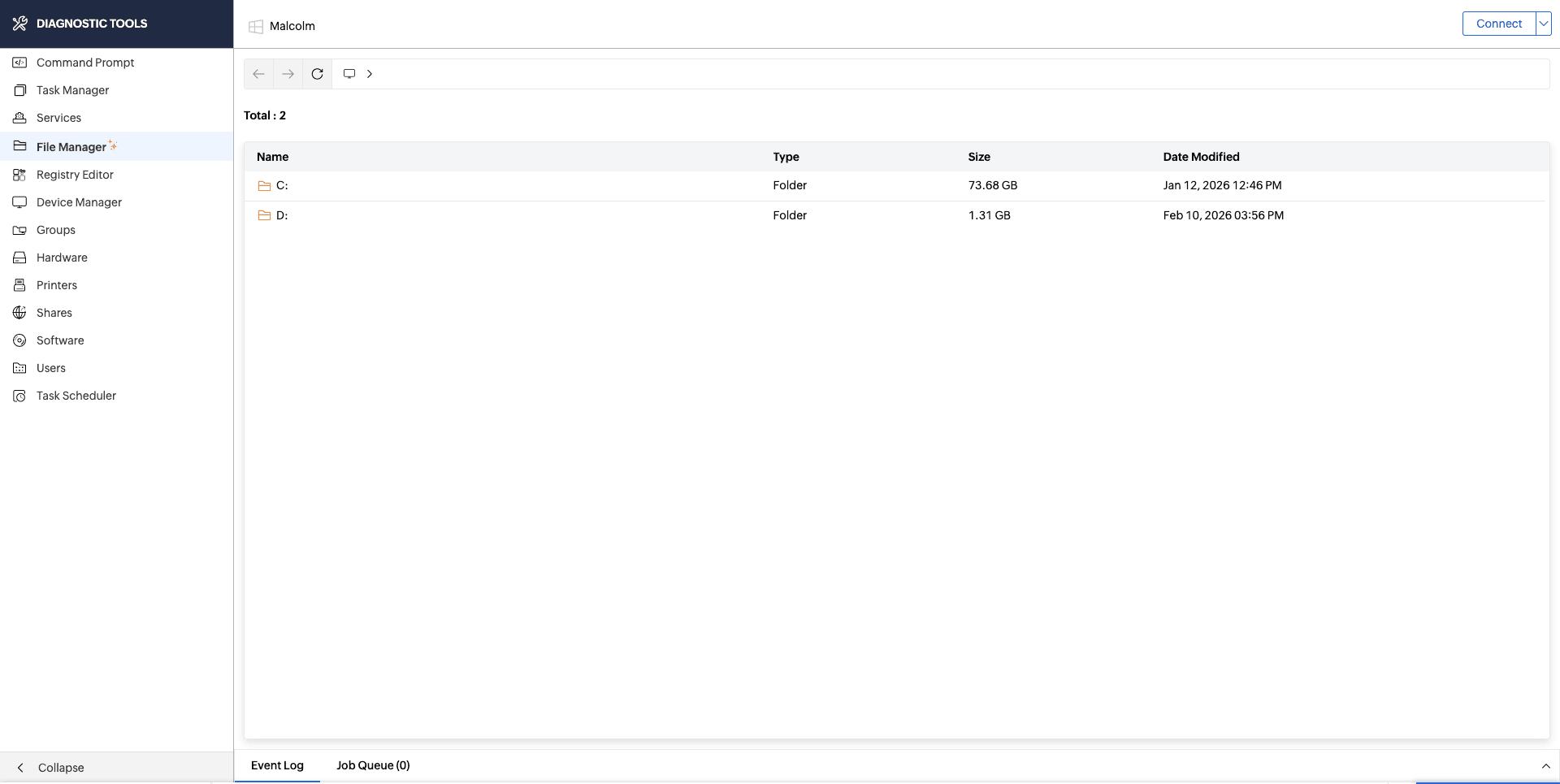 - During an Active Session - Click Tools > Diagnostics from the session toolbar and select File Manager.