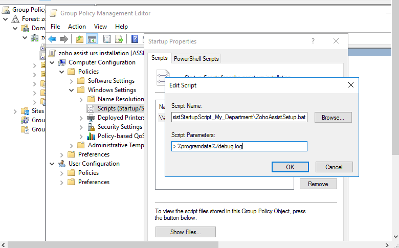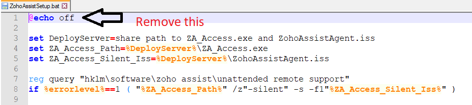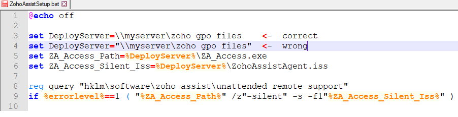 set DeployServer=share path to ZA_Access.exe and ZohoAssistAgent.iss xcopy %DeployServer% <localpath> /zohoassistgpofiles /c /q /e /k /h /y /i cd <localpath> /zohoassistgpofiles <localpath> /zohoassistgpofiles/ZA_Access.exe /z"-silent" -s -f1" <localpath> /zohoassistgpofiles/ZohoAssistAgent.iss" |