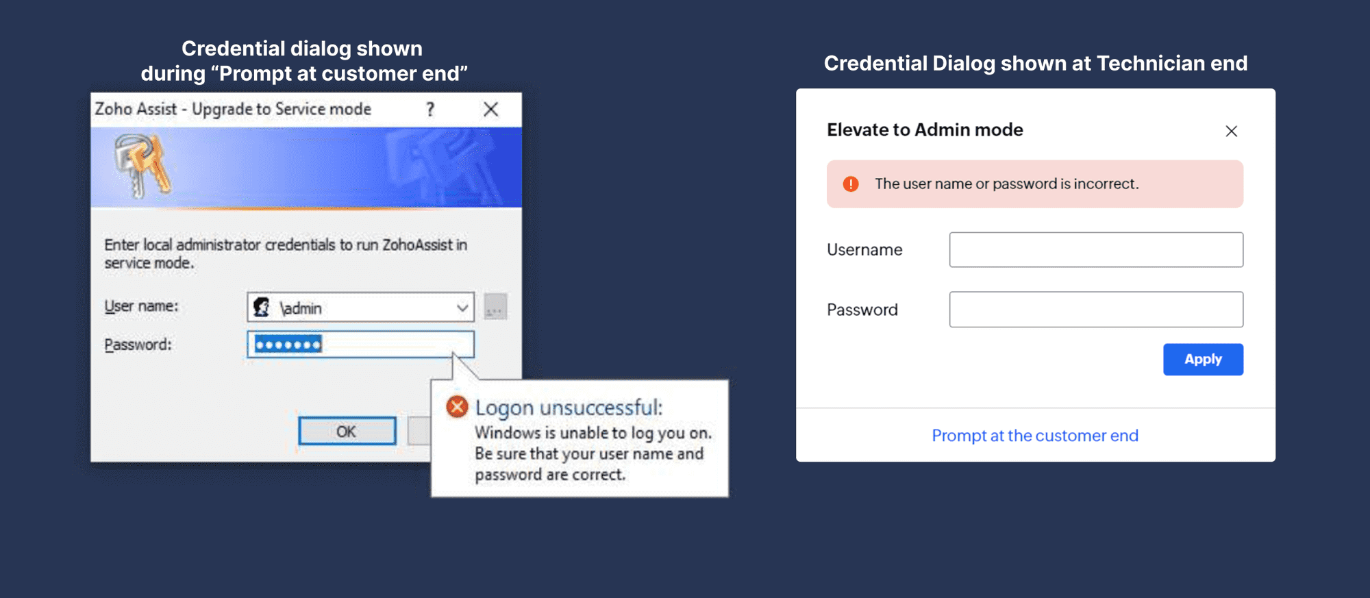 Local administrator user accounts on the remote machine are listed in the drop-down menu of the Prompt at customer end credential dialog.