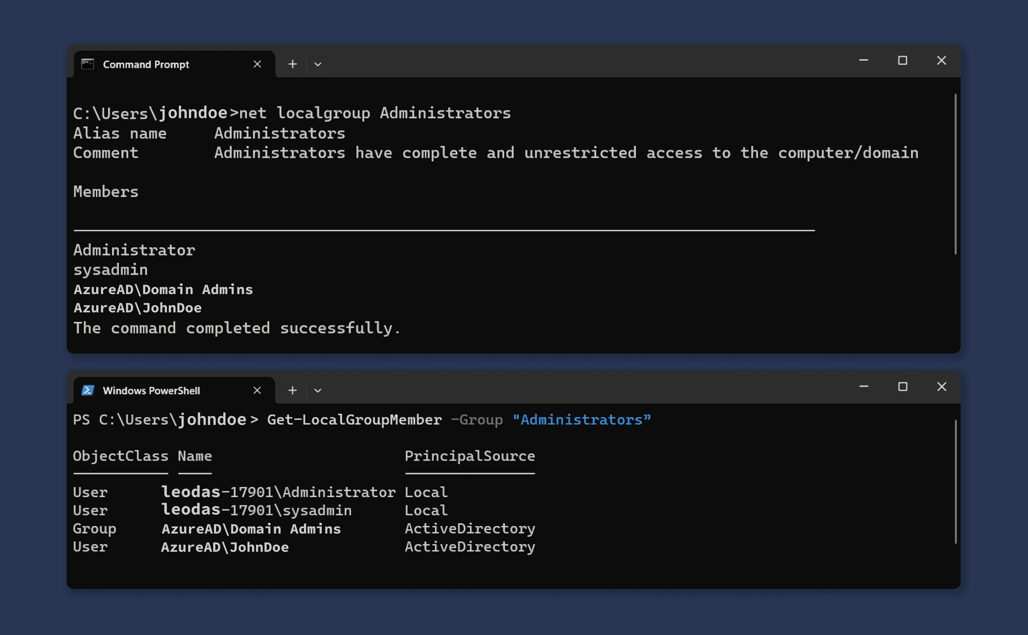 - For powershell : Get-LocalGroupMember -Group "Administrators”