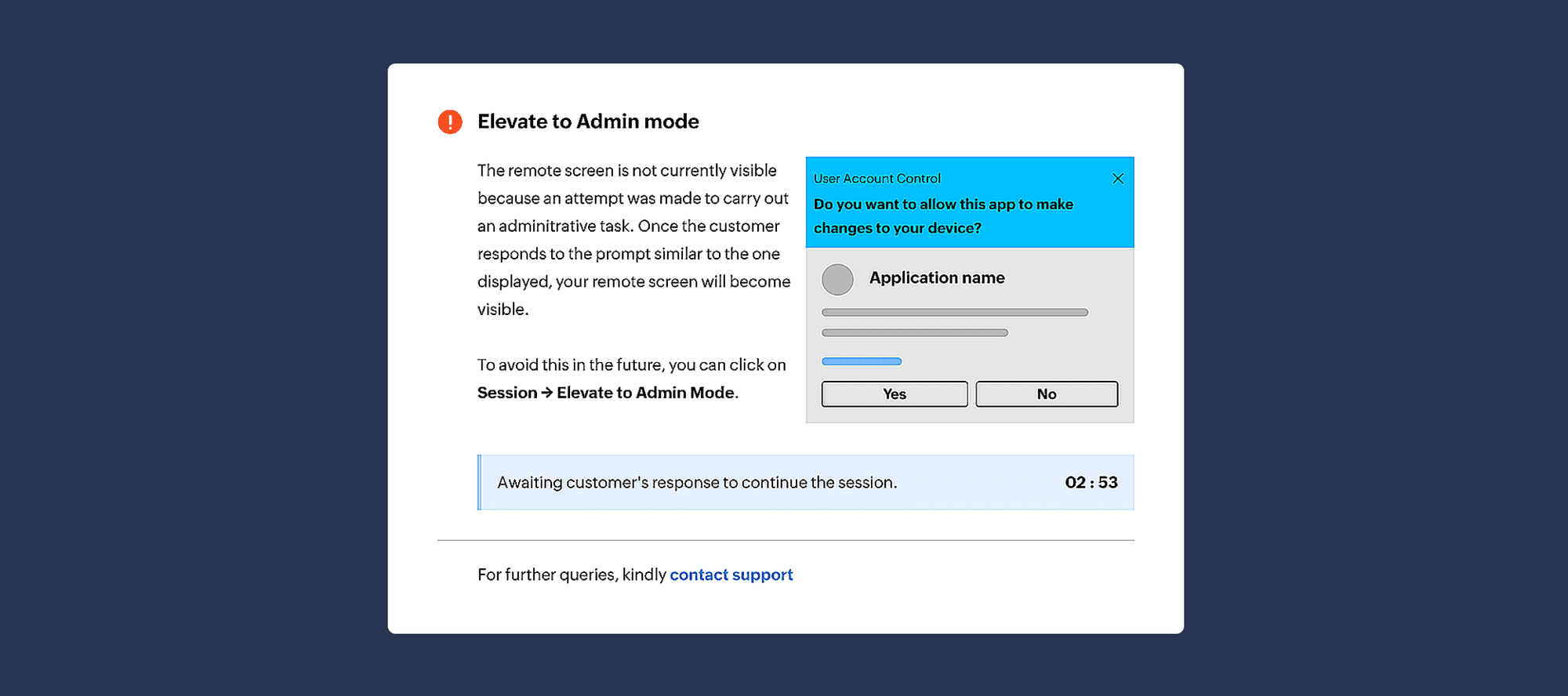 - In such cases, a Blocking Dialog appears on the technician's screen, indicating that the customer must promptly respond to the Windows UAC consent pop-up shown remotely or the technician must wait for three minutes for the pop-up to close automatically.