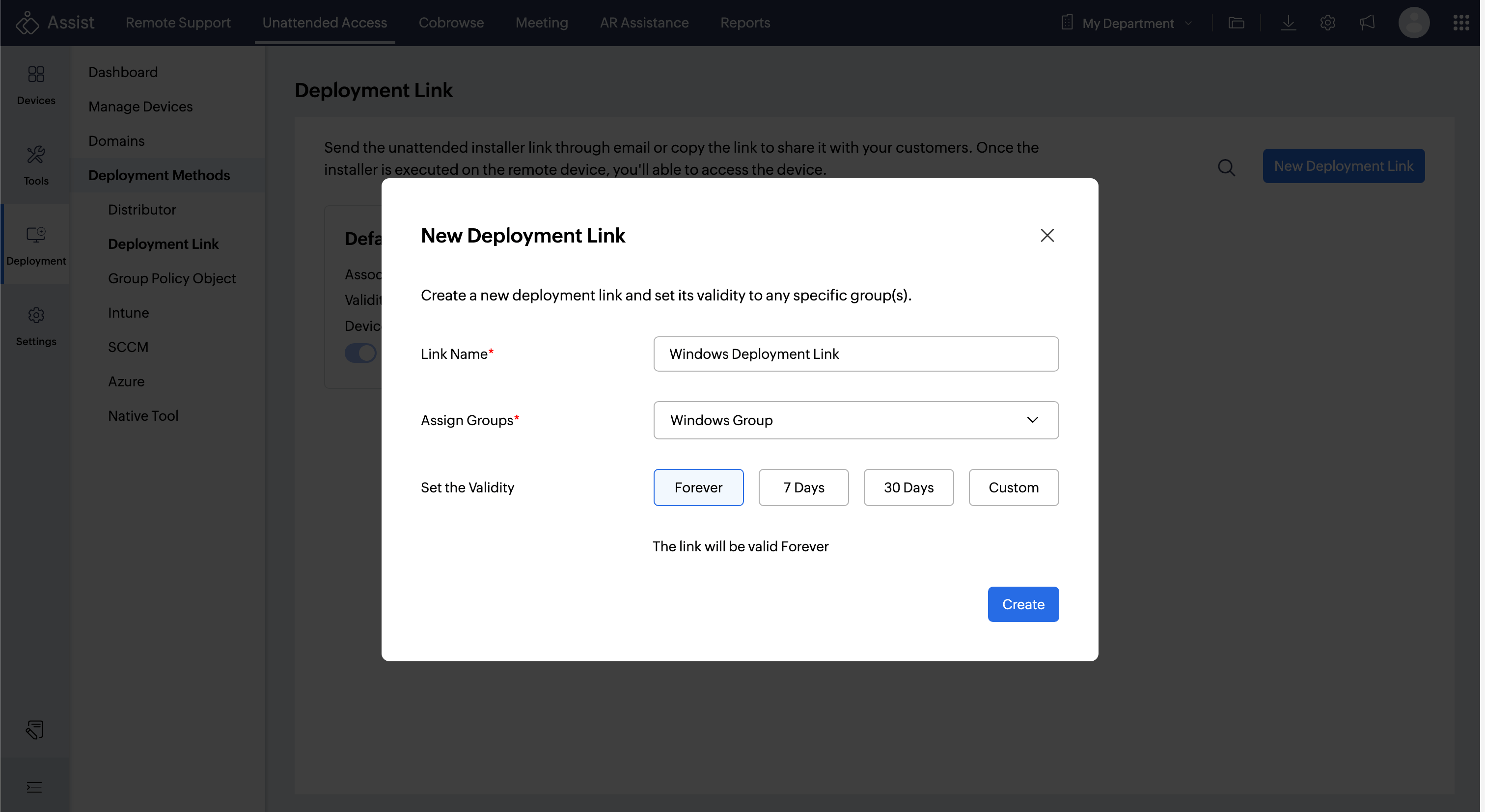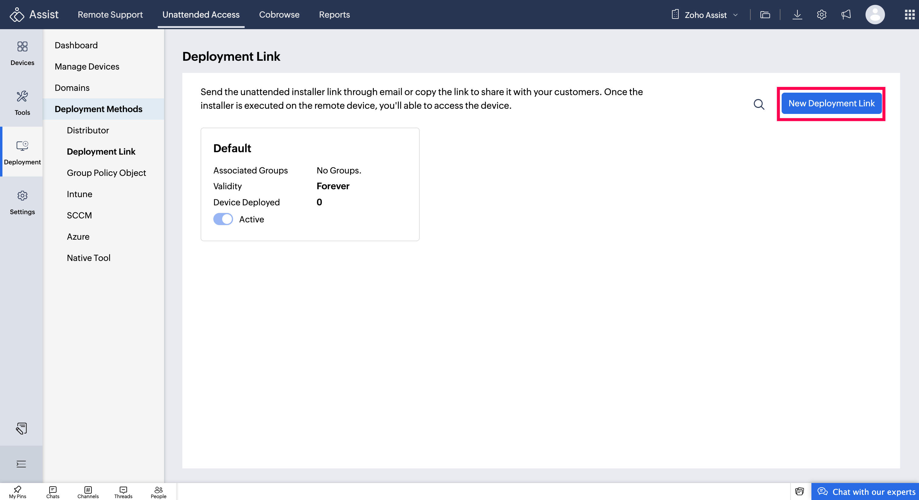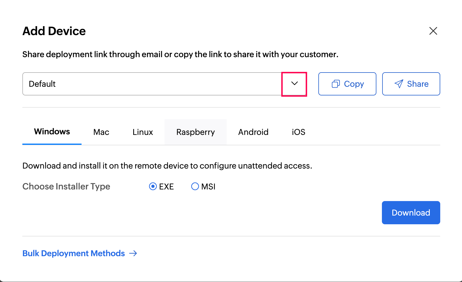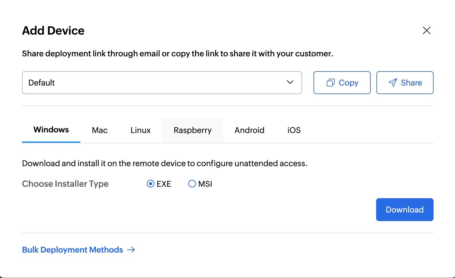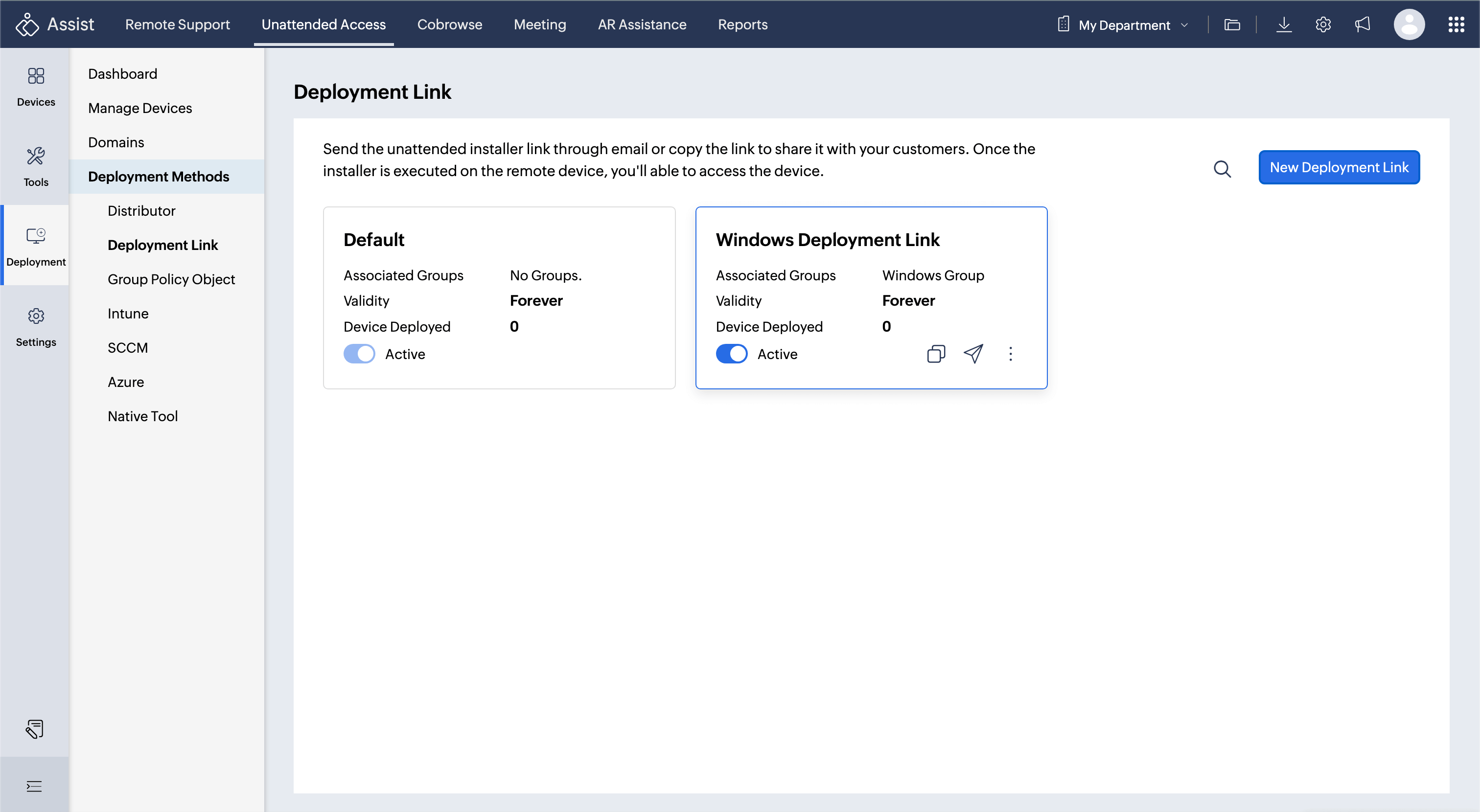 You can also share the default deployment link from Unattended Access > Deployment > Deployment Link under Deployment Methods and click the copy or share icon.