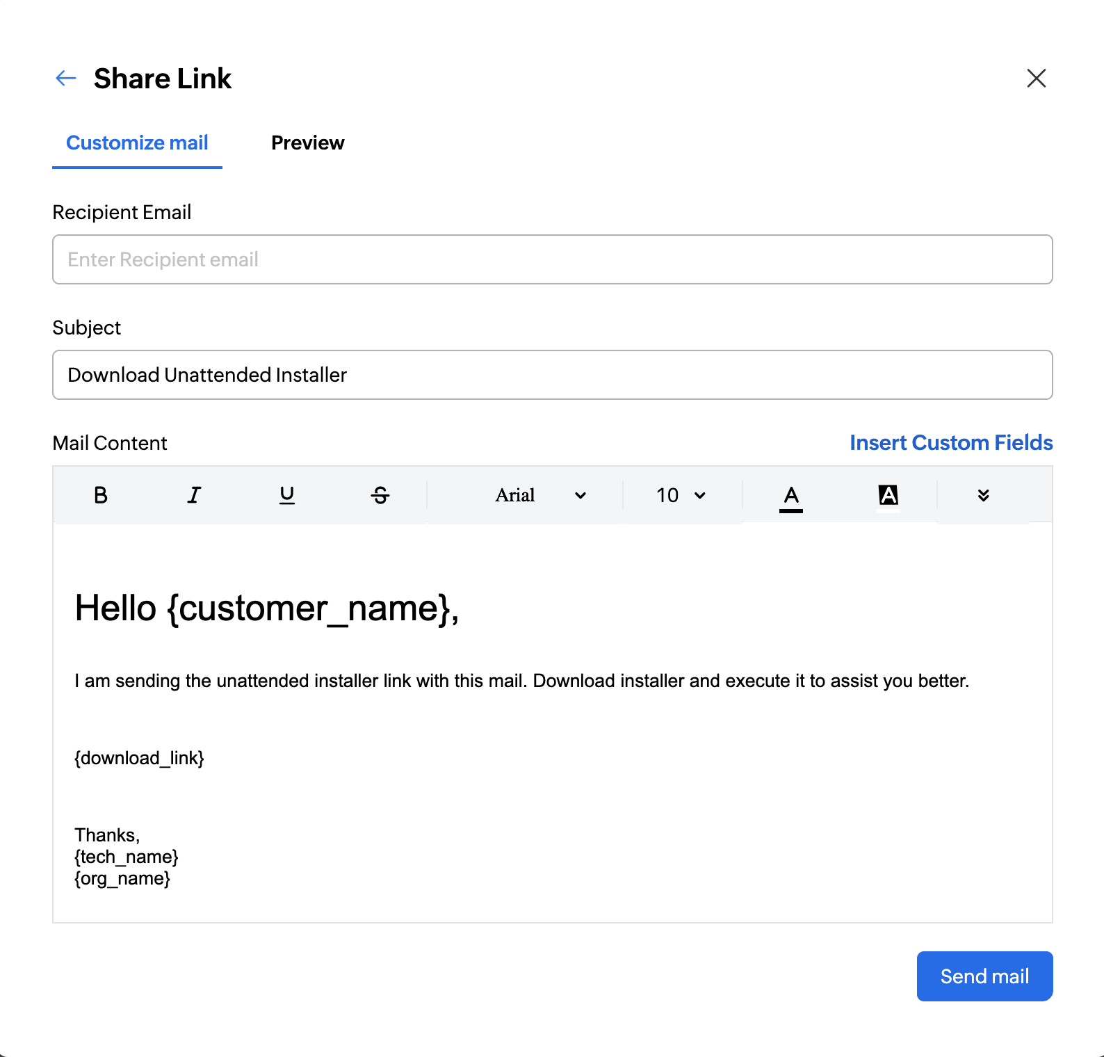Just copy the deployment link directly from the website or share it with your customers via email. Customers can simply run the downloaded file to complete the unattended access setup. This method is ideal when the end user is present but the technician does not have physical access to the device.