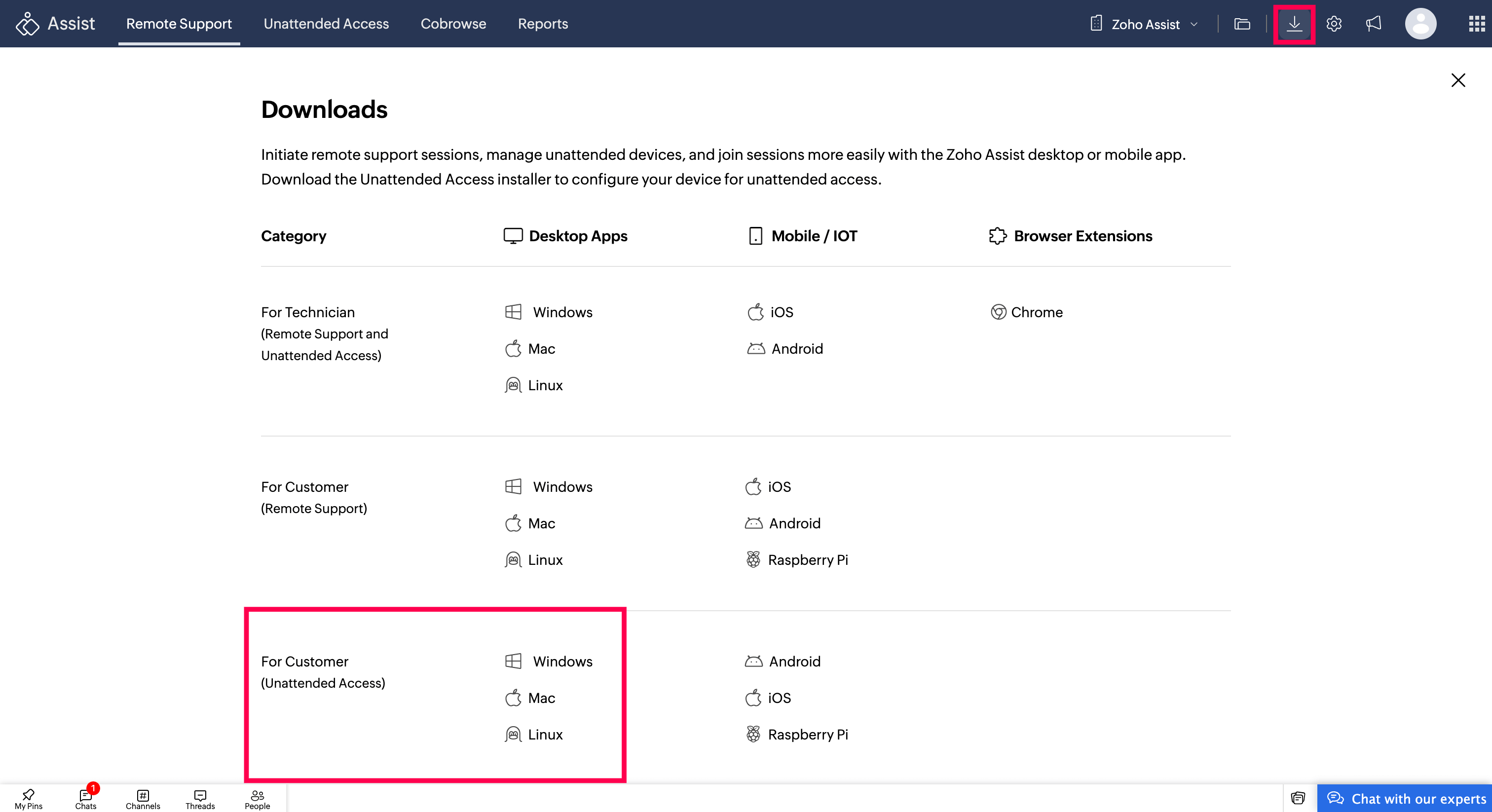 Under the For customer (Unattended Access) category, navigate to Desktop Apps.