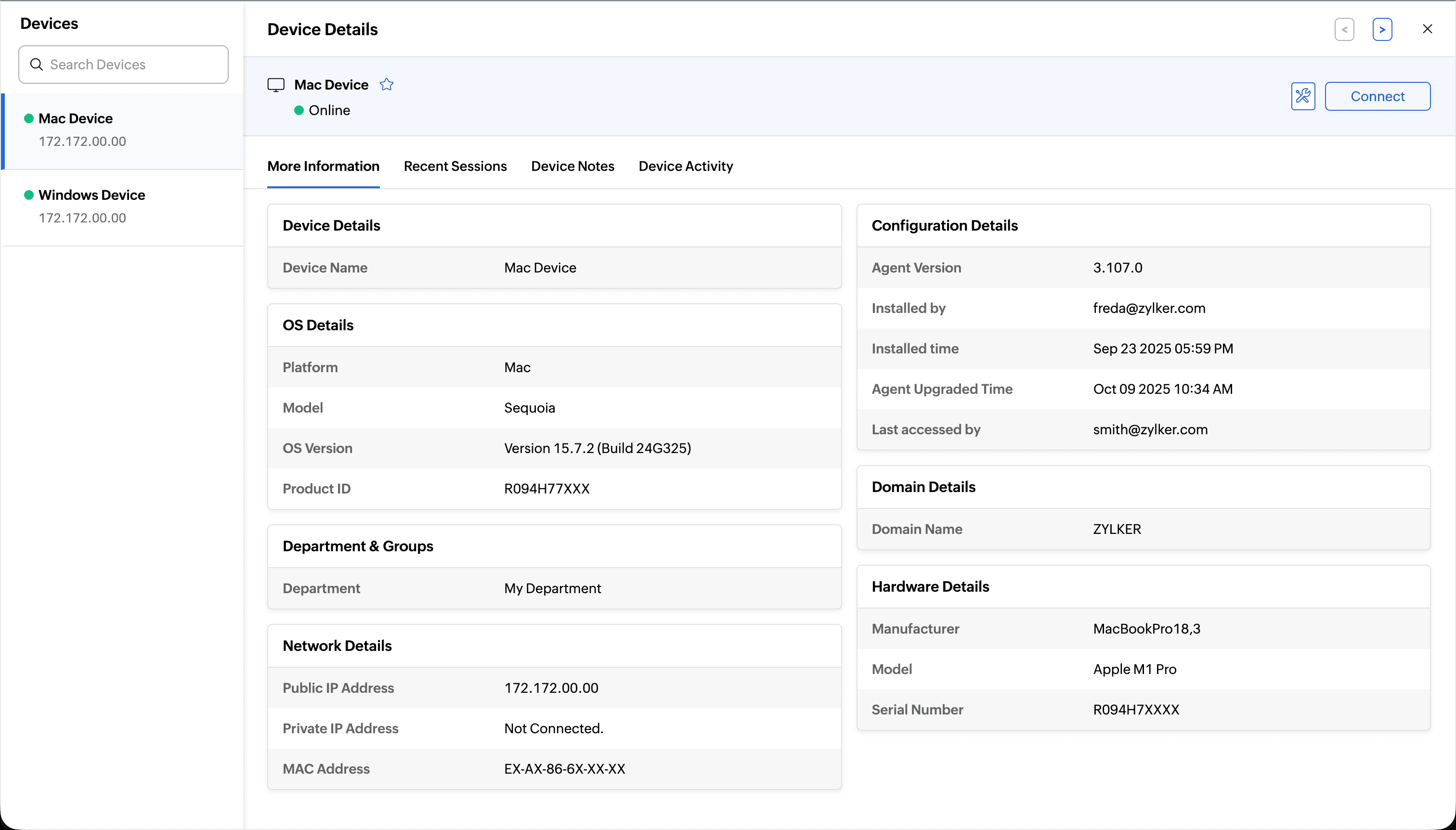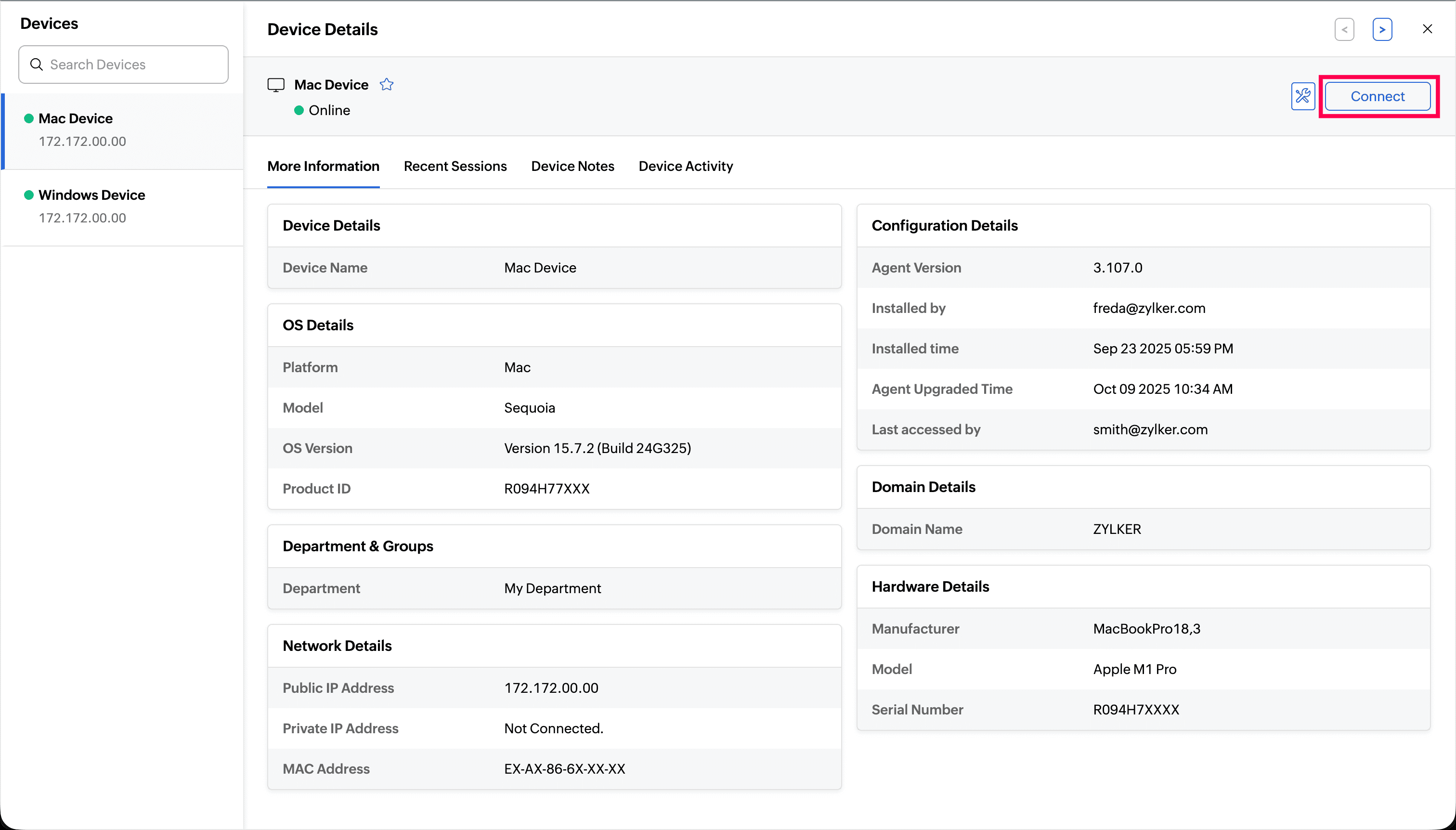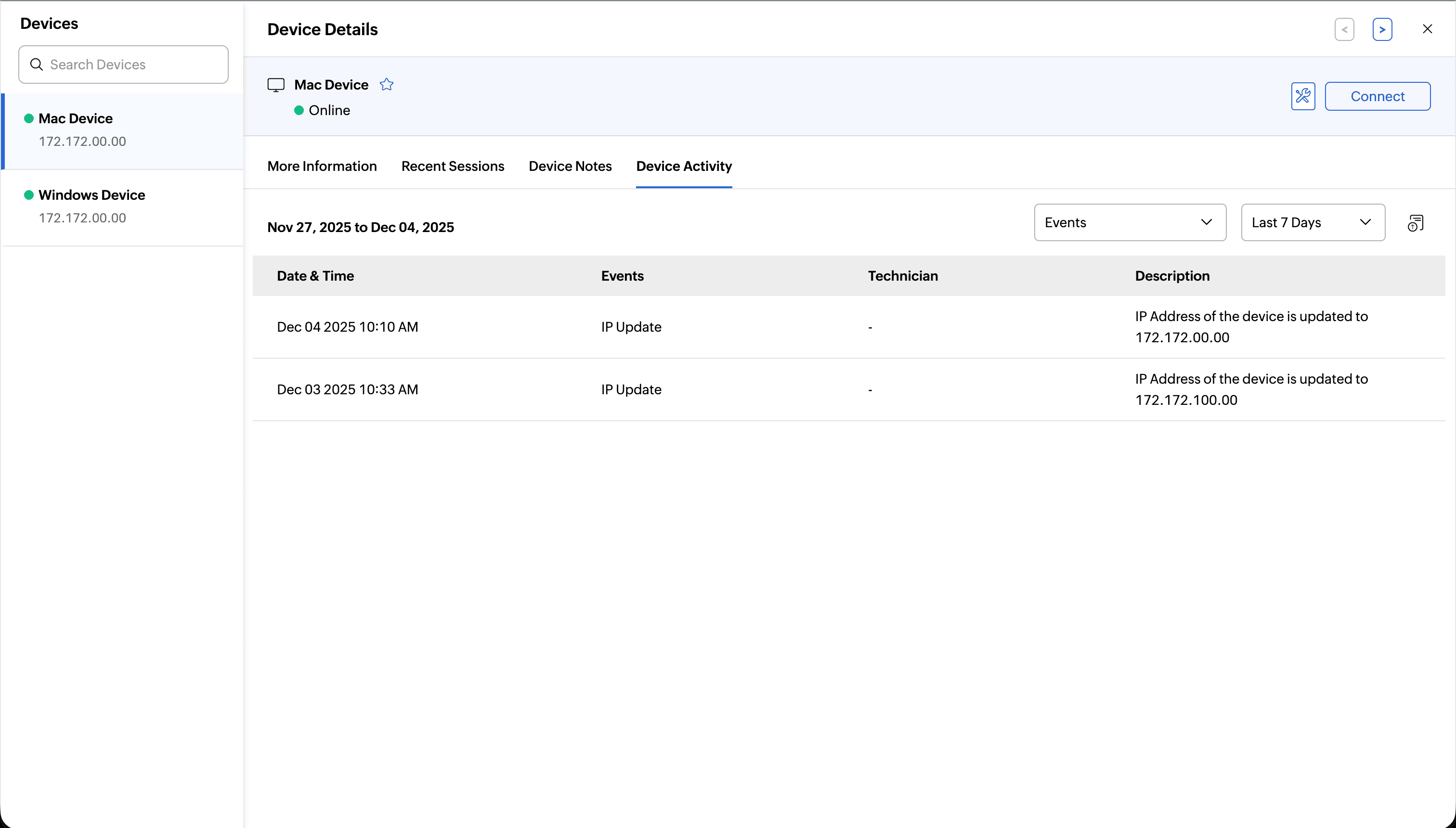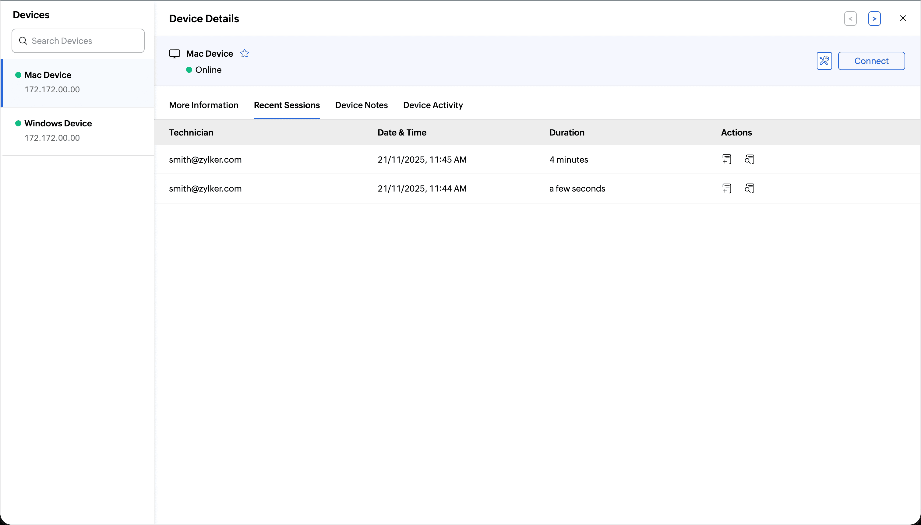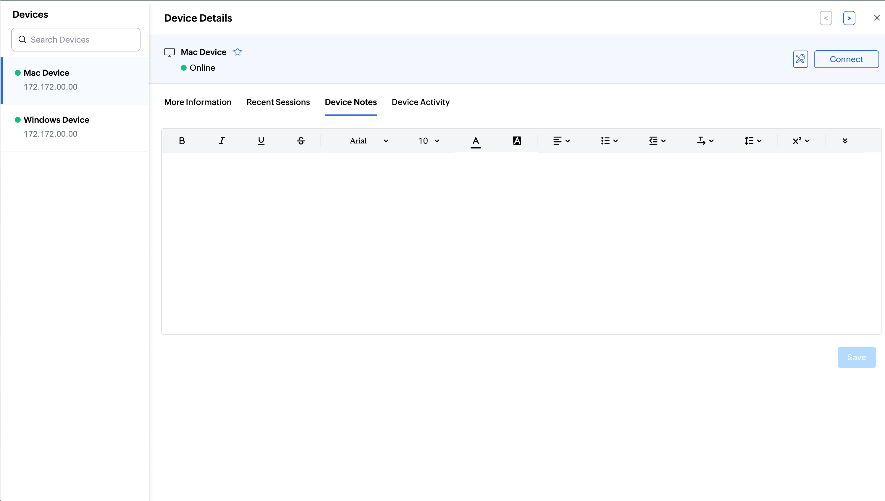 From the Device Details page, you can immediately initiate remote action. Click Connect to establish a remote session.