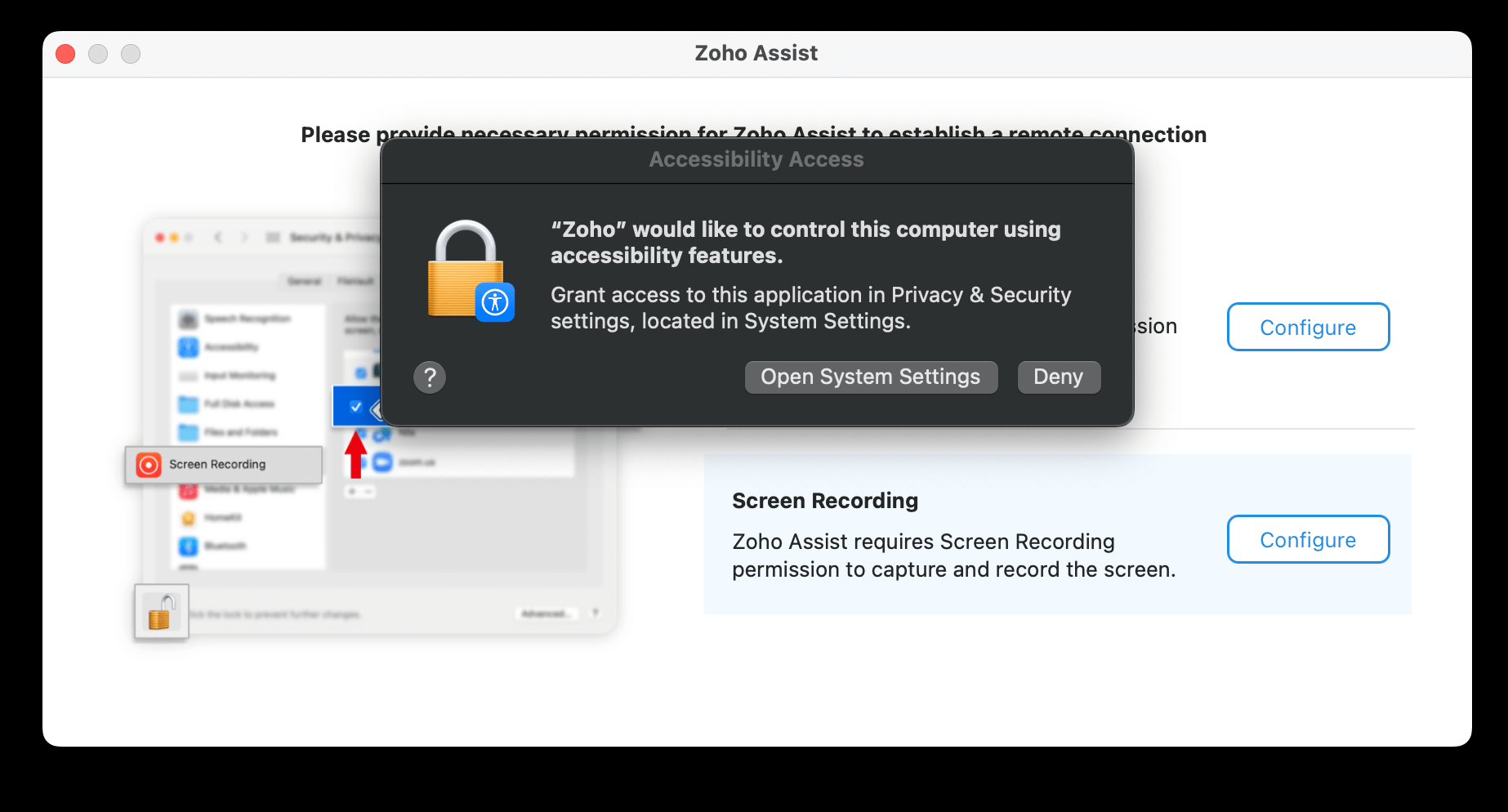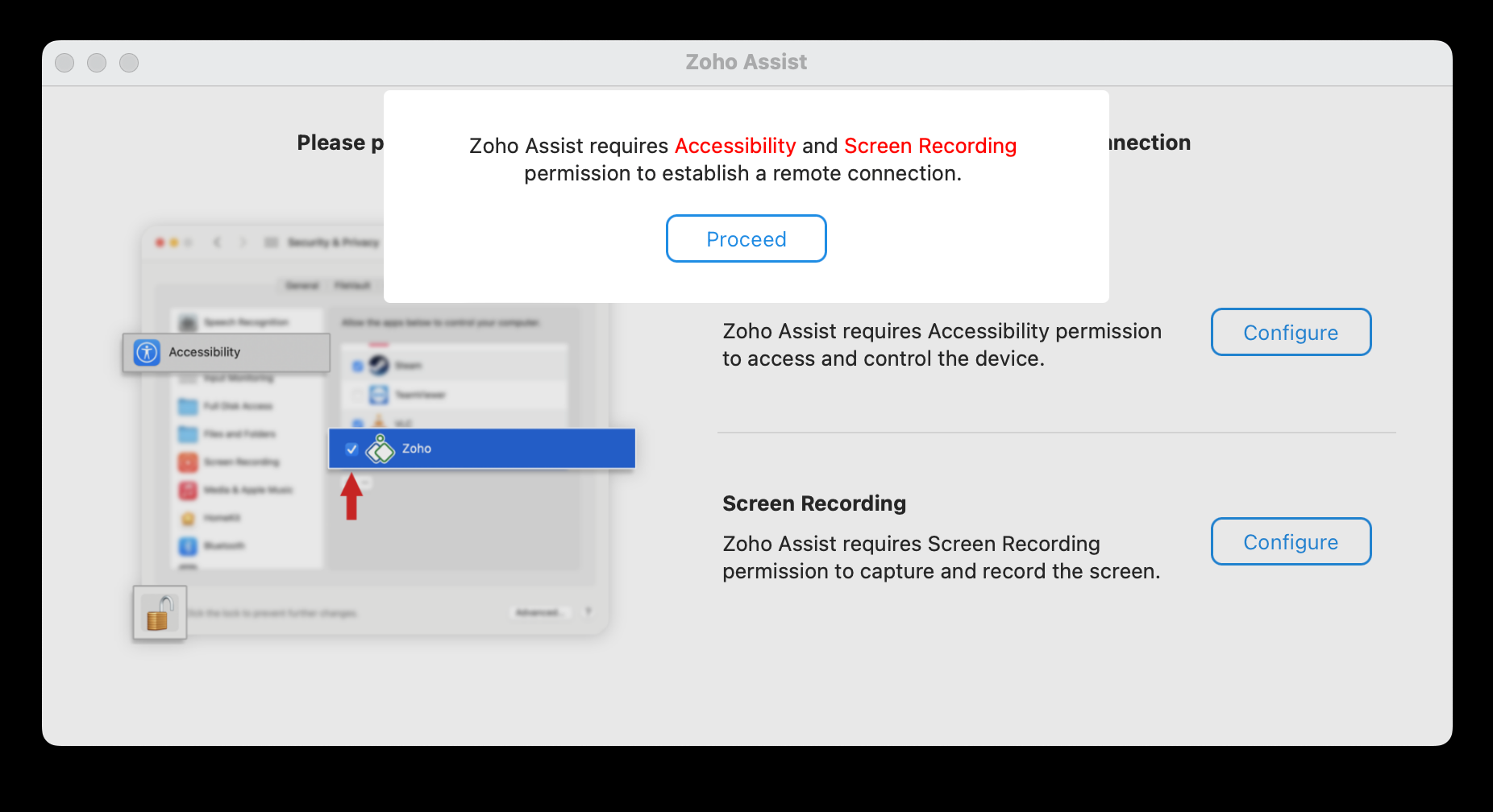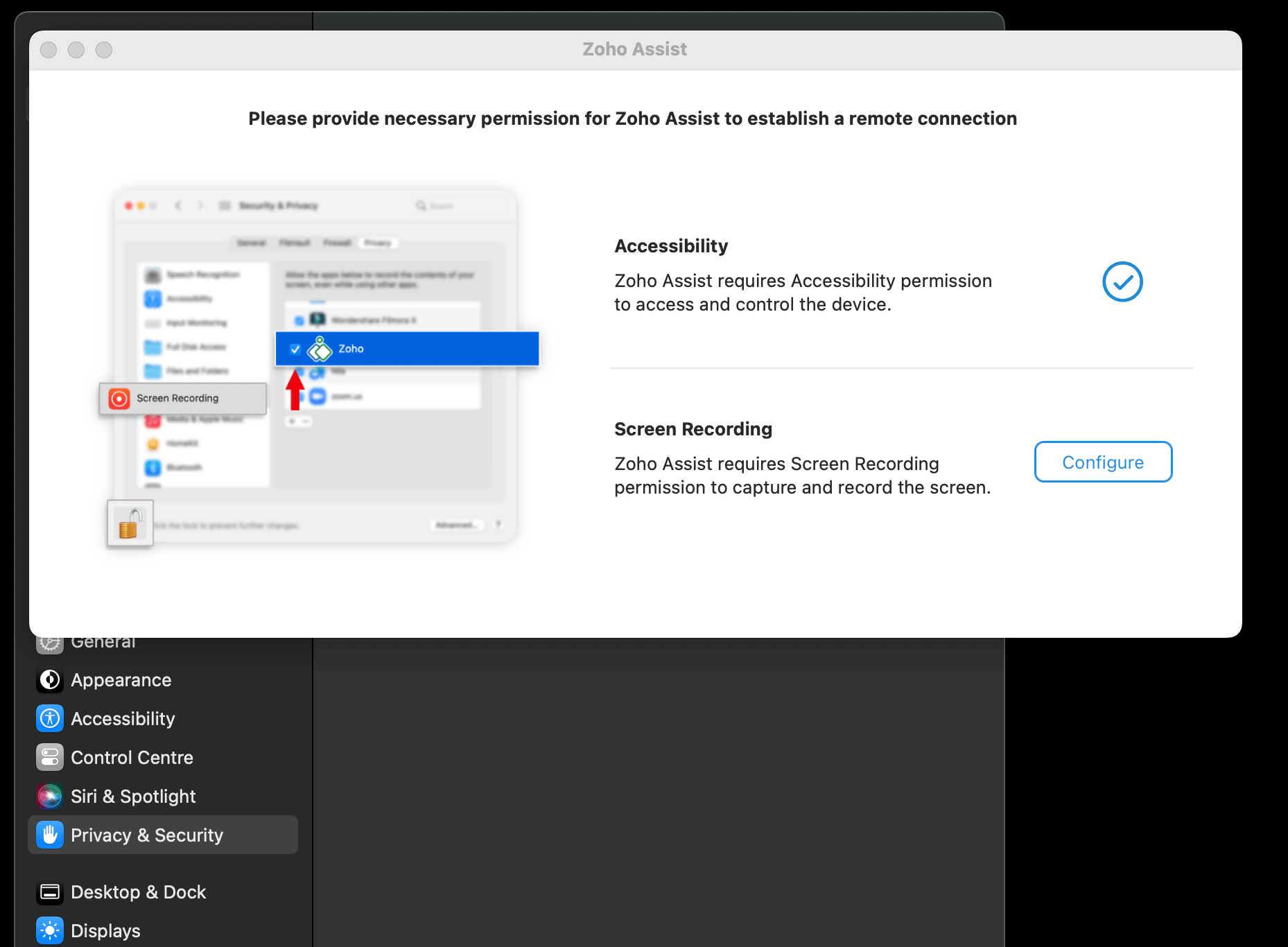 Mac devices of version 10.14 and above come with default privacy restrictions that automatically disallow accessibility and screen recording permissions for the system. Consequently, Zoho Assist is unable to obtain the essential permissions needed to remote control the customer's Mac desktop . To initiate remote sessions, it's essential to configure accessibility and screen recording permissions for Zoho Assist.