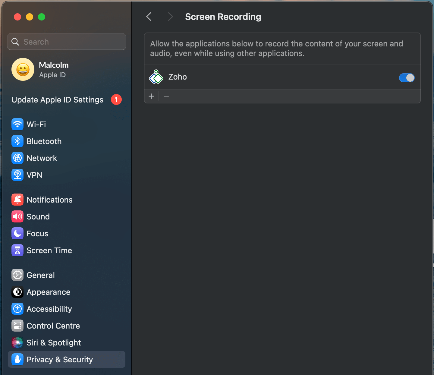 Repeat the above-mentioned steps for Screen Recording permissions as well.