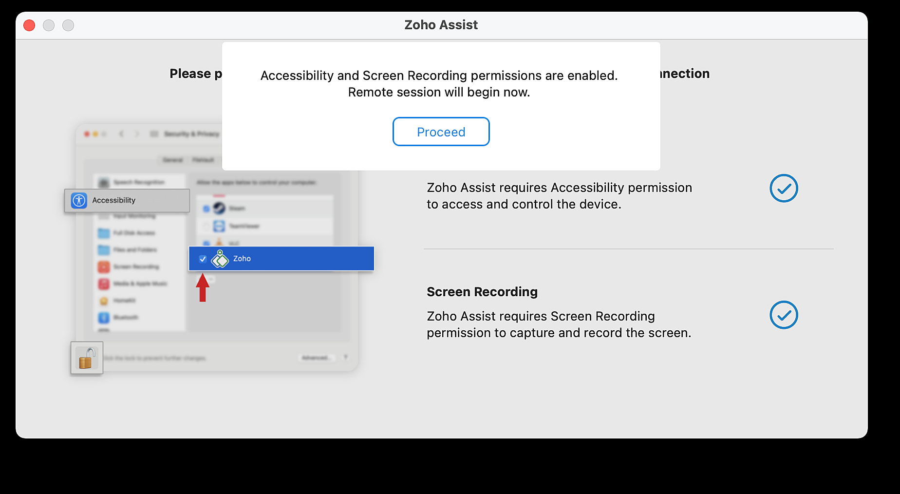 Once both the permissions are enabled, Click Proceed. The technician will now have access and control over the MacOS device. These permissions will be enabled for all future remote connections.