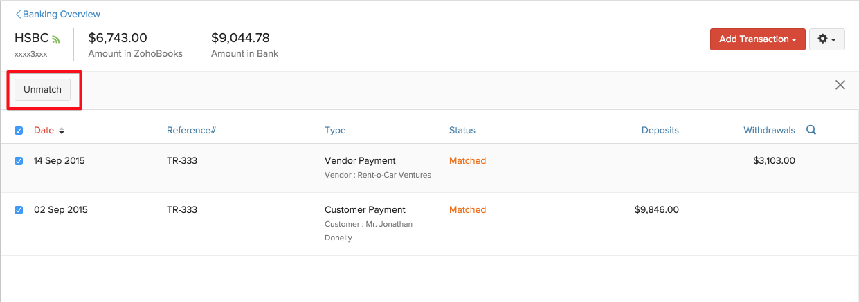 There might be days where you might have incorrectly matched transactions in Zoho Books with those in the bank statement. In such a case, you can choose to unmatch those transactions. Here’s how: