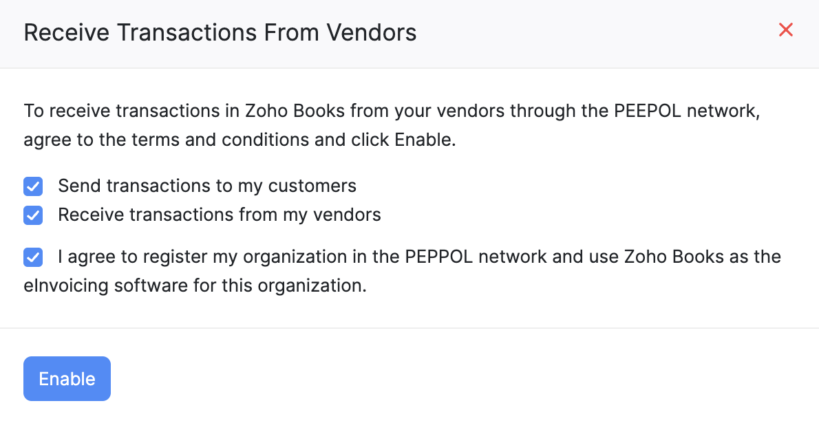 Note: You can receive transactions from your vendors only if you’re in the Professional and above plans of Zoho Books.