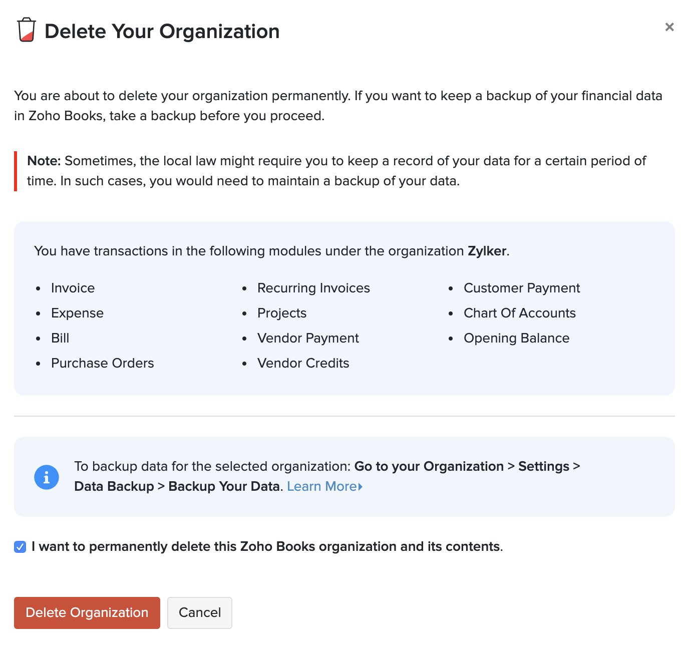 Prerequisite: It is strongly recommended to take a backup of the organisation before deleting it, as all data will be permanently deleted. To backup your data in Zoho Books, go to Organisation > Settings > Data Backup > Backup Your Data. Read our help document for more details on Data Backup.