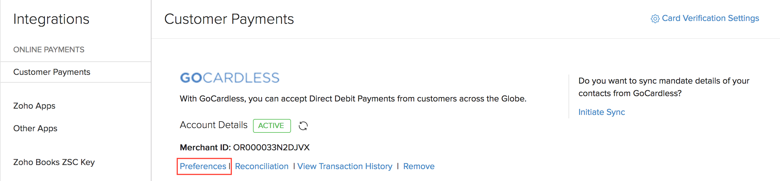 Zoho Books is integrated with major online payment gateways to help you receive payments for your invoices online. This ensures faster, hassle-free payment receipt and further automates your cash flow and bookkeeping. To set up a payment gateway, click the Gear icon on the top right and select Online Payments. You’ll find the list of payment gateways that Zoho Books supports.