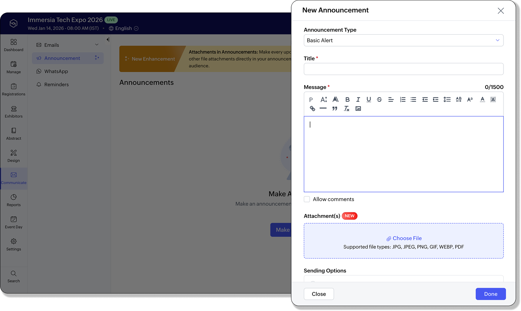UpdatesOrganizers can now enhance their scheduled emails by directly attaching images and PDFs (up to 10MB) for all participants.